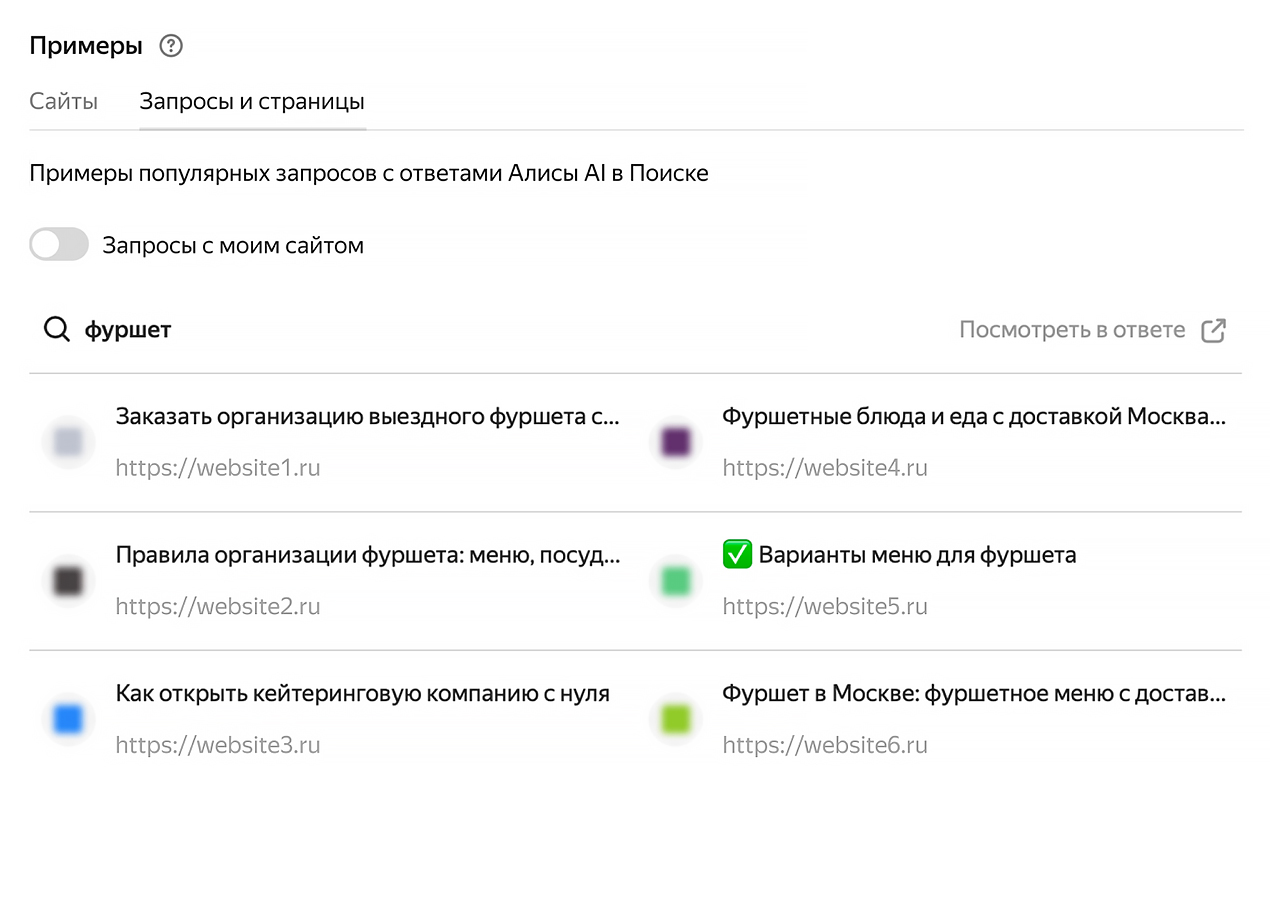 - примеры запросов, по которым сайт попадает в блок ответов нейросети;