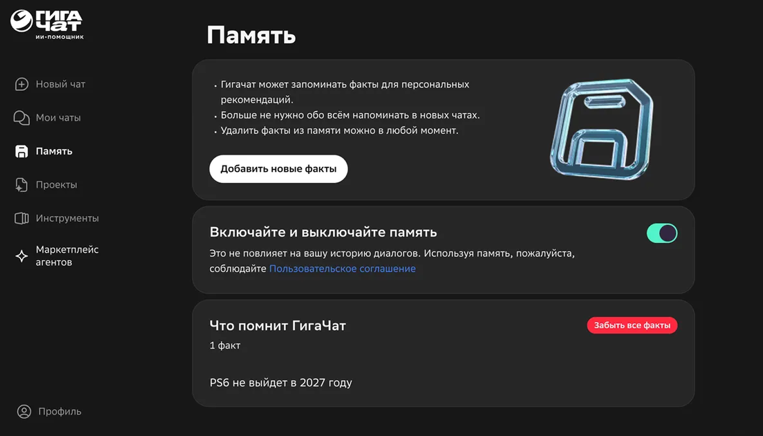 У чат-бота появилась долгосрочная память. Модель сохраняет факты о пользователе между сессиями и использует их в последующих разговорах. ИИ-помощник запоминает увлечения, профессию, образование, жизненные цели, привычки, а также личные данные о пользователе, его близких и питомцах.