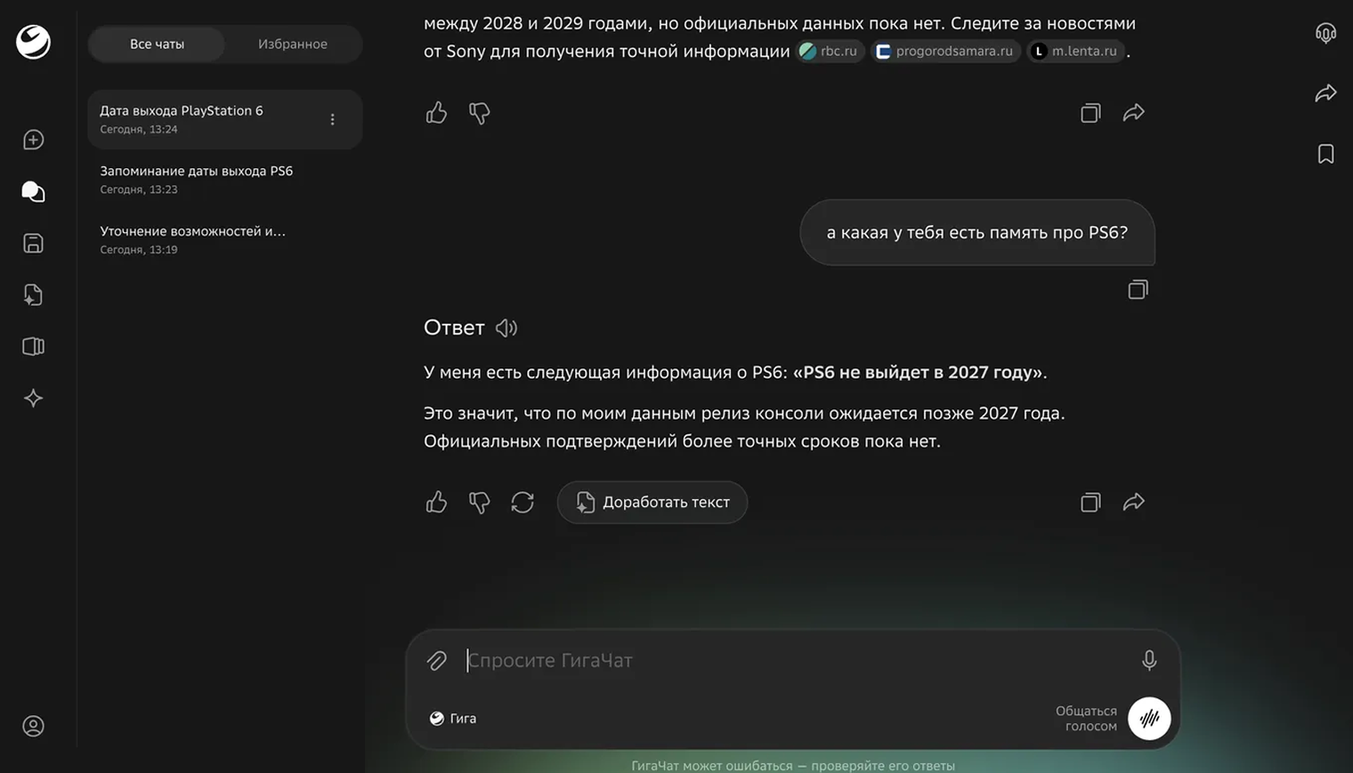 В Сбере отмечают, что данные хранятся в едином профиле и синхронизируются между веб-версией, мобильными приложениями и телеграм-ботом при авторизации по «Сбер ID». Функцию памяти можно включить или отключить в настройках.