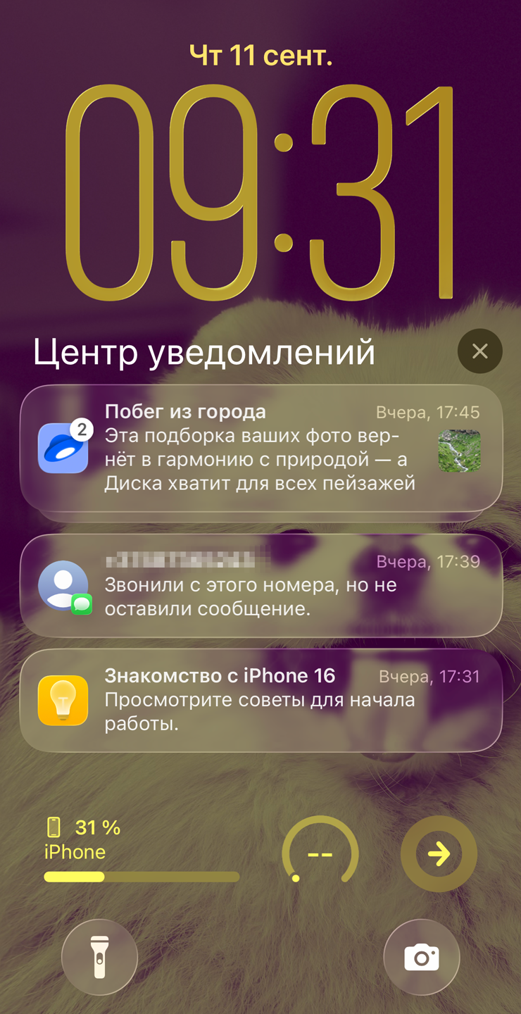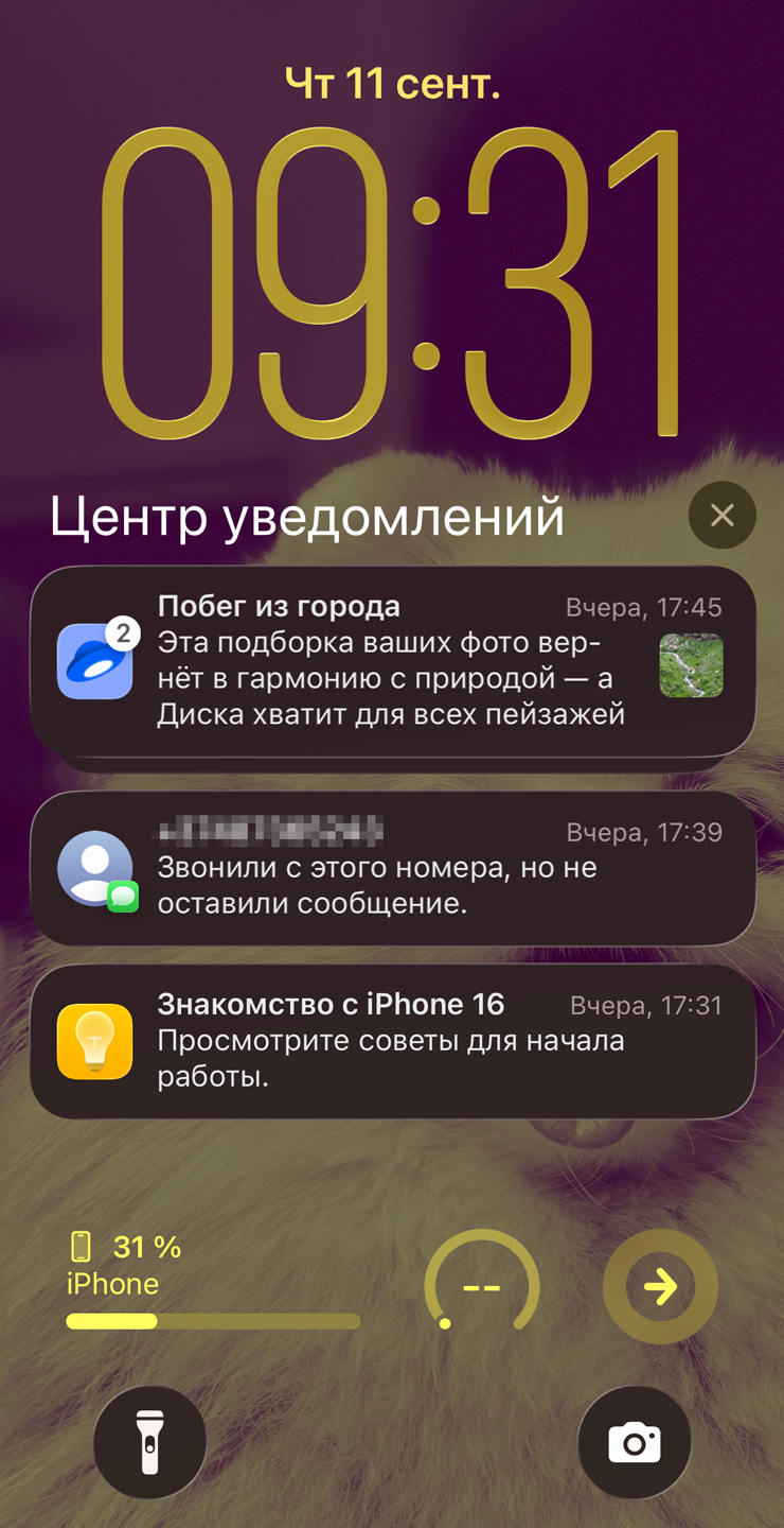 Apple заметно переработала меню блокировки. Теперь часы автоматически растягиваются и сжимаются в зависимости от свободного места на экране. А объект на переднем плане отдаляется от фона, что создает эффект параллакса.
