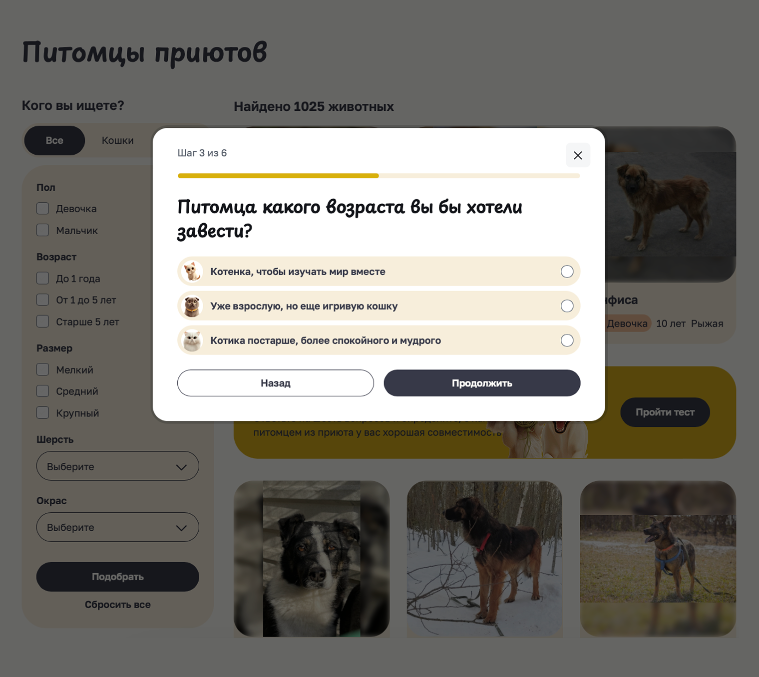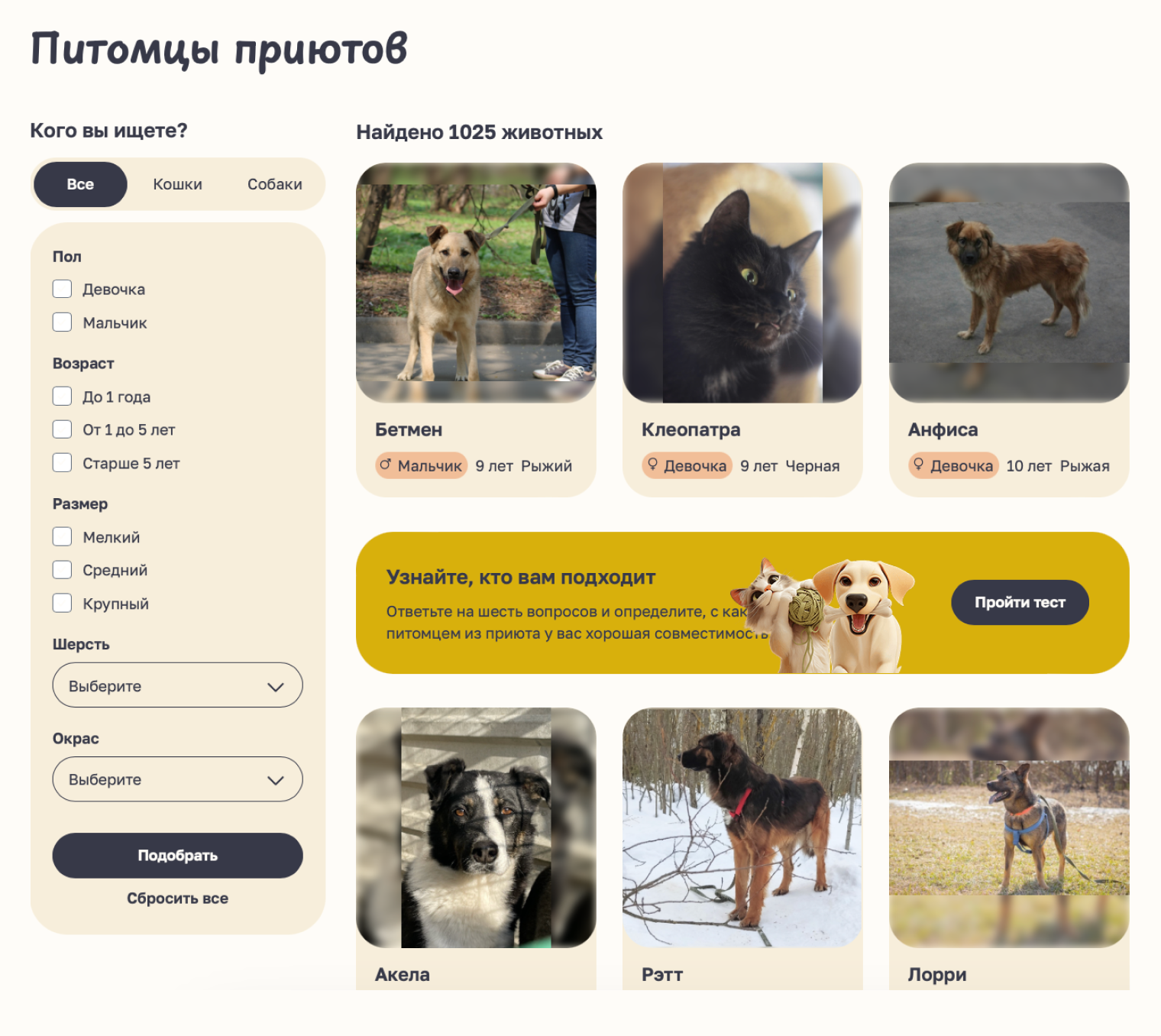 Чтобы выбрать питомца, можно воспользоваться фильтрами: указать тип животного, отметить пол, возраст, размер, длину шерсти и окрас. Еще один вариант — пройти специальный тест, где в ответах нужно указать свои предпочтения по тем же критериям. Система проанализирует заданные параметры и покажет наиболее подходящих под запрос животных.