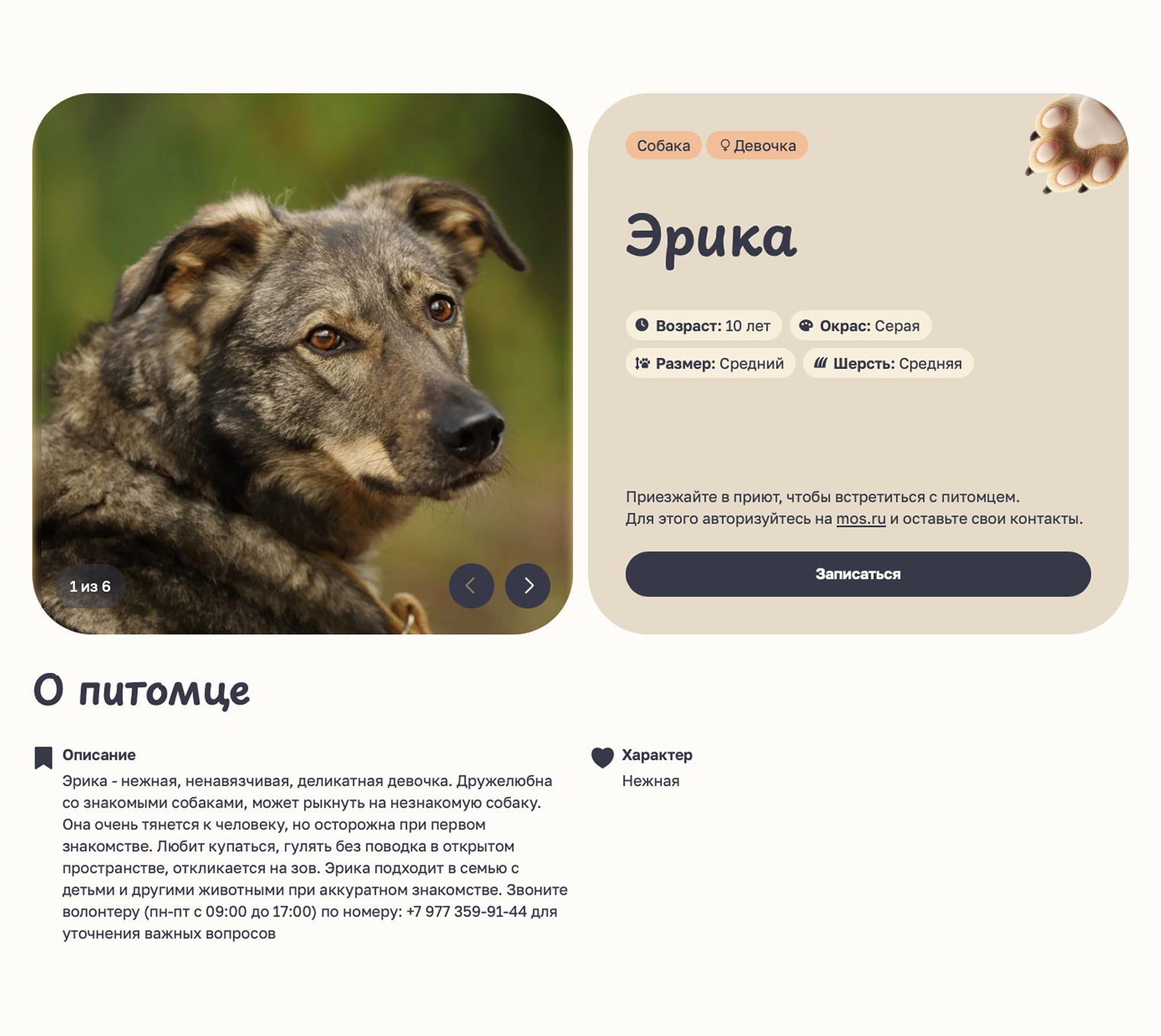 На странице каждого питомца есть его фотографии, описание внешности и характера, контакты приюта. Чтобы встретиться с понравившимся животным, нужно нажать кнопку «Записаться» и оставить свои данные. Сотрудник приюта свяжется с заявителем, чтобы уточнить день и время визита.