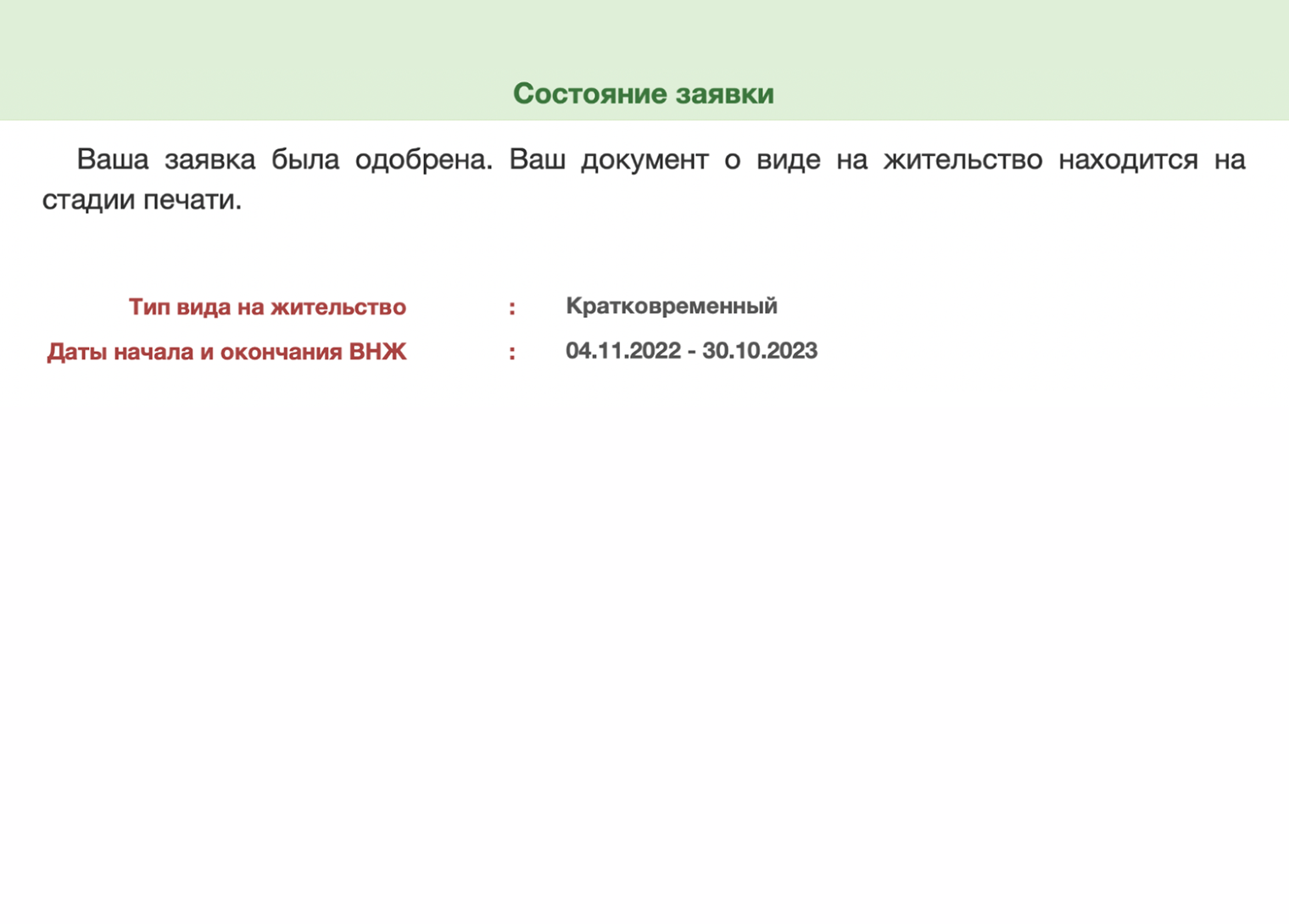 Через неделю после визита в миграционную службу я проверила статус заявки на сайте — было написано, что ее еще не начали рассматривать. Через две недели после подачи документов пришло сообщение — заявку одобрили. В смс было указано, что форму подтверждения можно скачать на сайте. Но мне эта форма не пригодилась. Например, с ней отказались продать сим-карту в салоне сотовой связи — требовали именно карту ВНЖ.