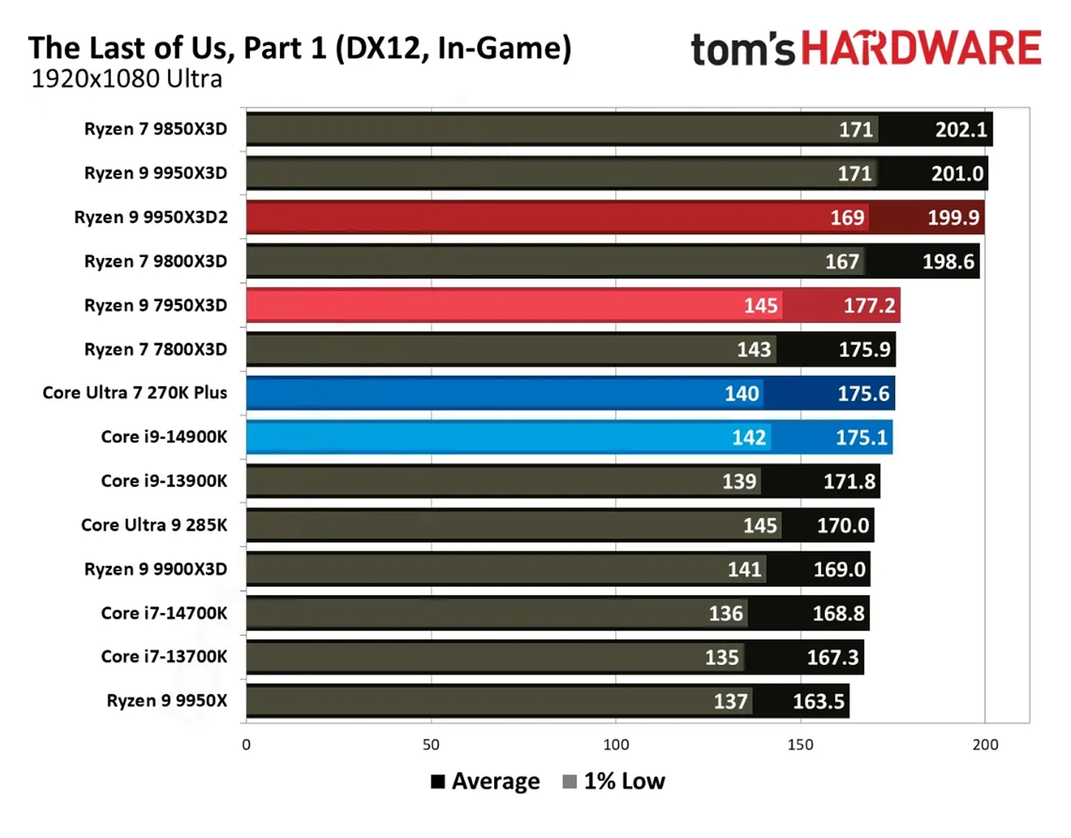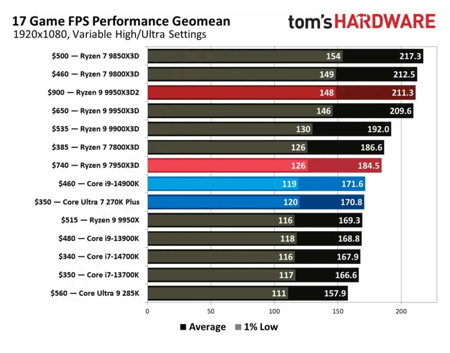На основе тестов 17 игр в 1080p процессор Ryzen 9 9950X3D2 тоже хоть и незначительно, но уступает старшим моделям по более низкой цене в количестве кадров в секунду.