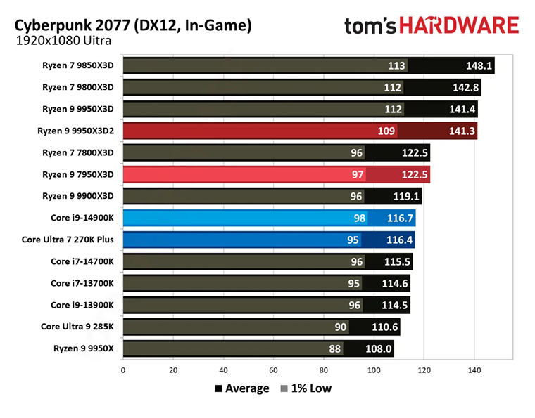 Ryzen 9 950X3D2 также опередил новый флагманский Intel Core Ultra 7 270K Plus, но всего на 9%.