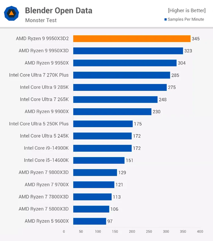 В тесте 3D-графики Blender чип Ryzen 9 9950X3D2 показал результат на 7% выше, чем у Ryzen 9 9950X3D, и на 13% выше, чем у стандартного Ryzen 9 9950X. Также новый чип опередил Intel Core Ultra 7 270K Plus на 21%.