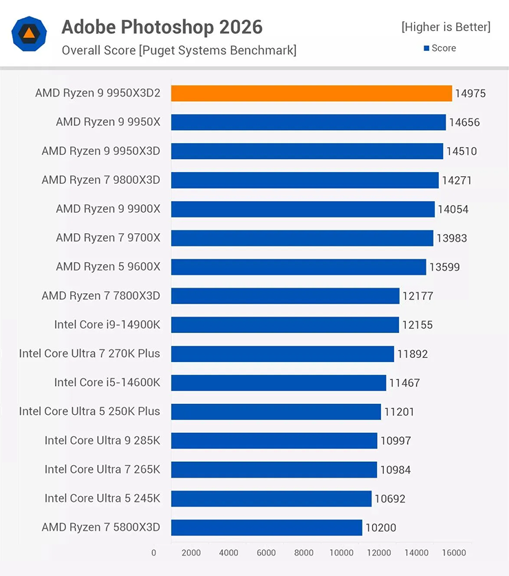 Ryzen 9 9950X3D2 показывает себя лучше и в Adobe Photoshop 2026. Благодаря дополнительному L3-кэшу процессор работает на 2% быстрее Ryzen 9 9950X3D и на 26% быстрее Intel Core Ultra 7 270K Plus.