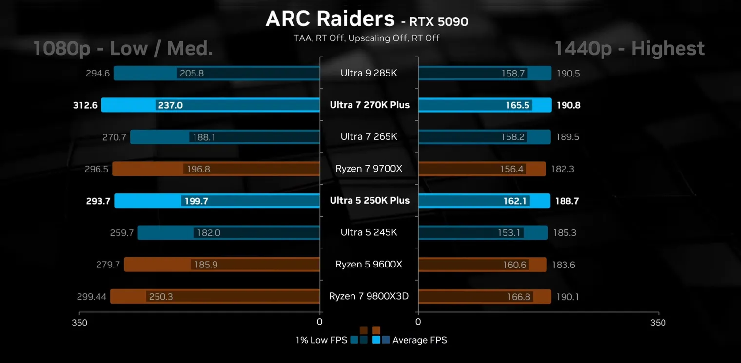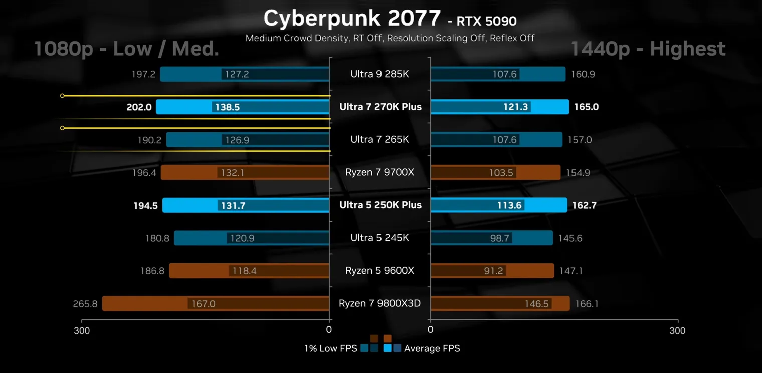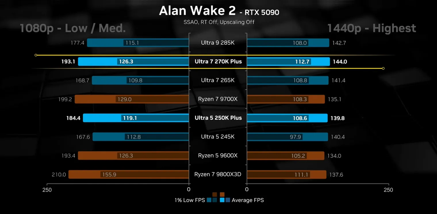 Особенно заметна разница между Ultra 250K Plus и Ryzen 5 9600X из одной ценовой категории при высоких настройках графики и разрешении 1440p. Прирост FPS в среднем составил от 10 до 20 кадров в секунду.