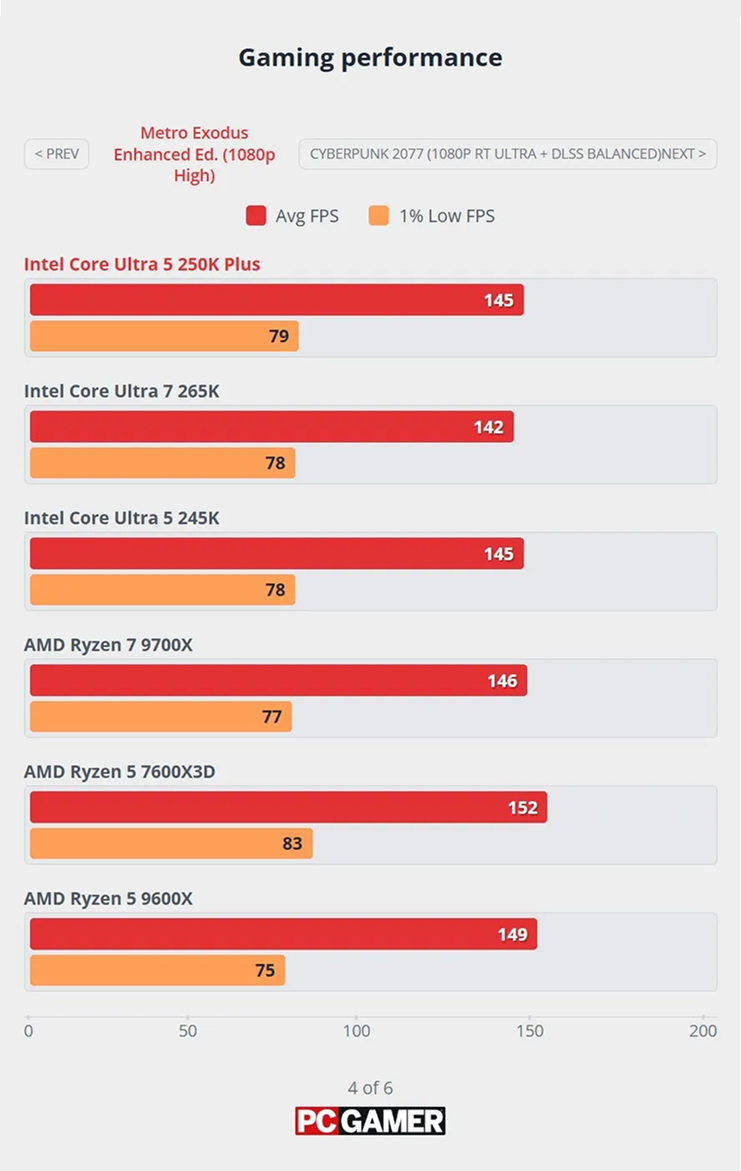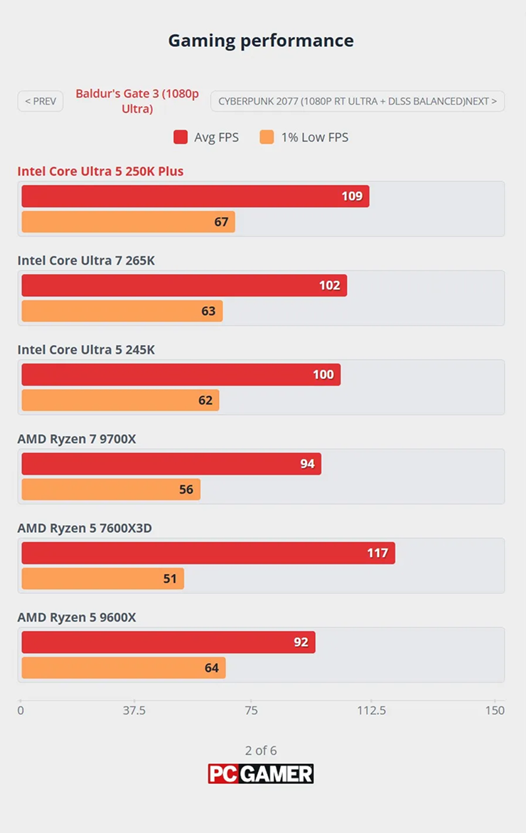Свои тесты провели и в издании PC Gamer. Они также подтвердили превосходство Ultra 5 250K Plus. Например, в Baldur’s Gate 3 при 1080p чип в среднем обеспечивает 109 FPS. Для сравнения, предыдущая модель с такими же настройками графики выдала 100 FPS, а у конкурента — Ryzen 5 9600X — частота кадров не превышает 92 FPS.