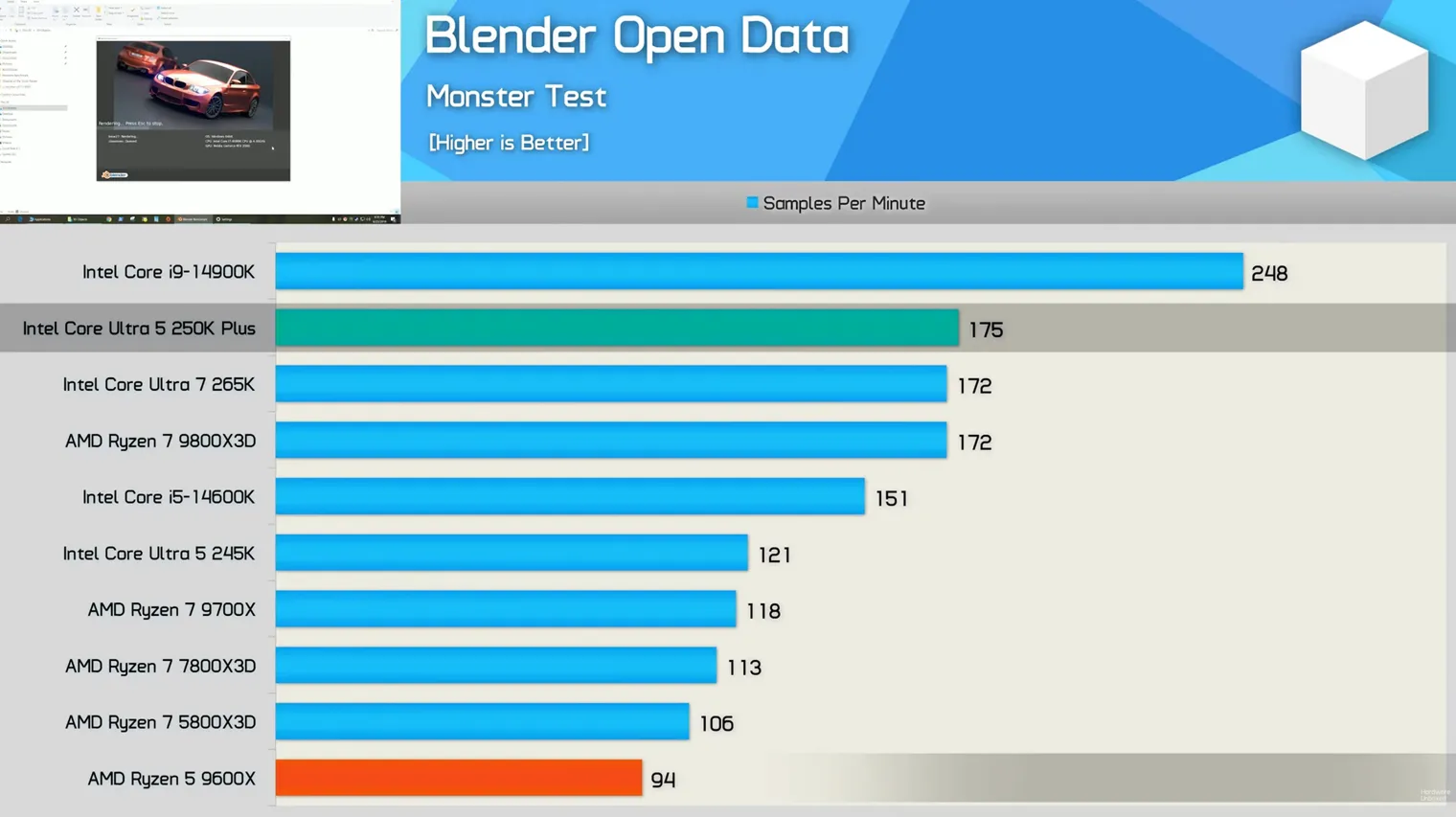 Почти аналогичная ситуация сложилась и в бенчмарке Blender. В нем младший чип Intel Ultra 5 показал скорость на 86% выше, чем у сравнимого по цене Ryzen 5 9600X. В целом по производительности в профессиональных программах он зачастую уступает только Core Ultra 7 265K.
