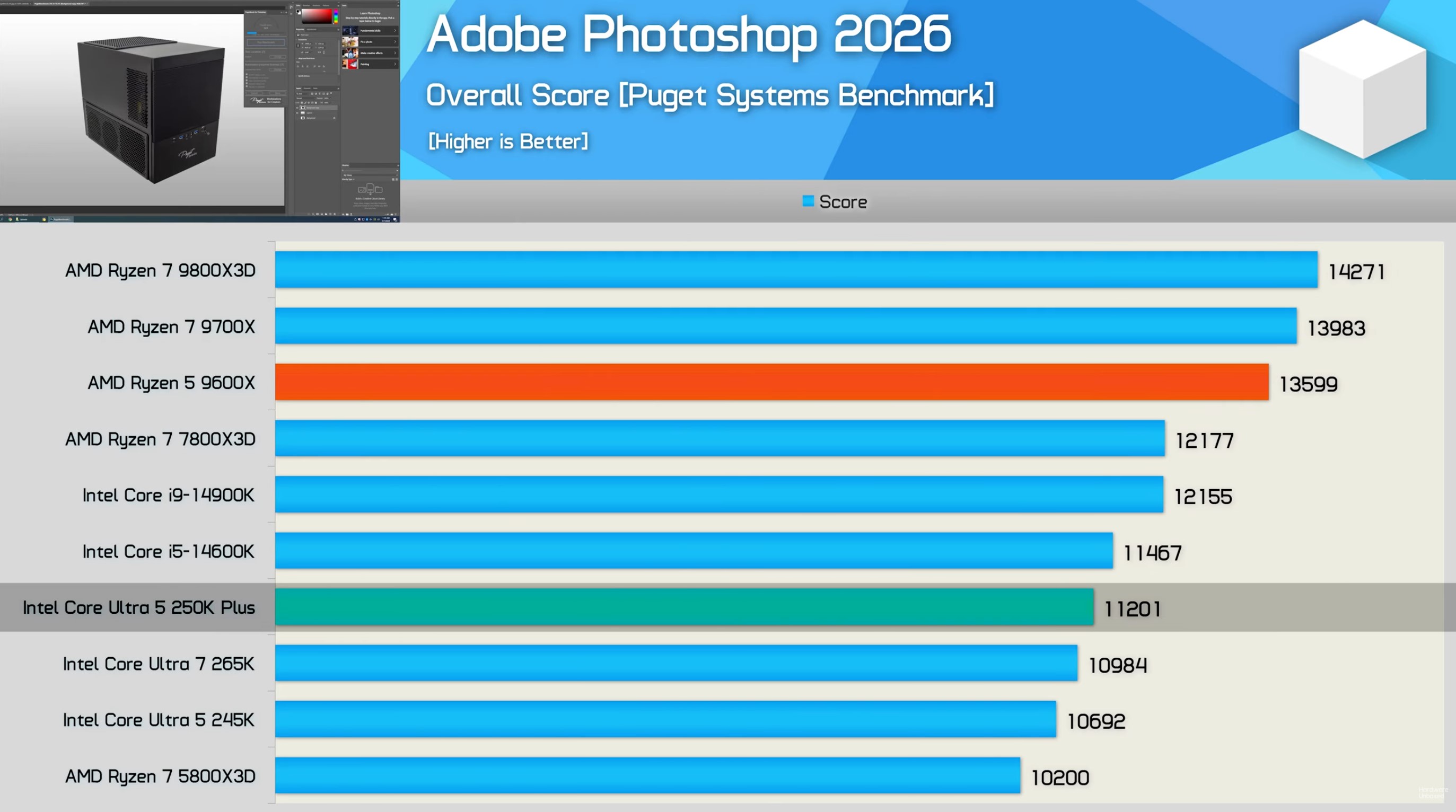 Примечательно, что при всей мощности 250K Plus работает медленнее Ryzen 5 9600X в Adobe Photoshop, хотя результаты в Premiere Pro у него лучше.