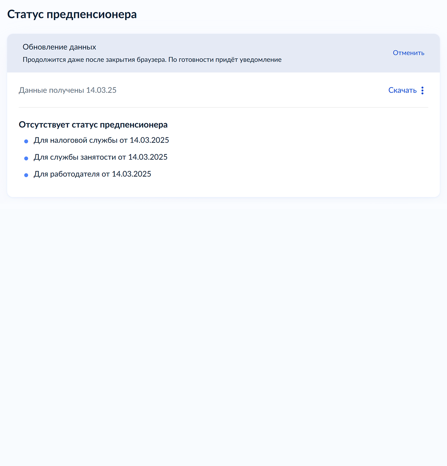 Сведения из реестра предпенсионеров может запросить кто угодно в любом возрасте. В справке будет указано, относитесь вы к этой категории или нет. А если в статусе откажут, вам предложат получить выписку из индивидуального лицевого счета и дополнить ее недостающими сведениями.
