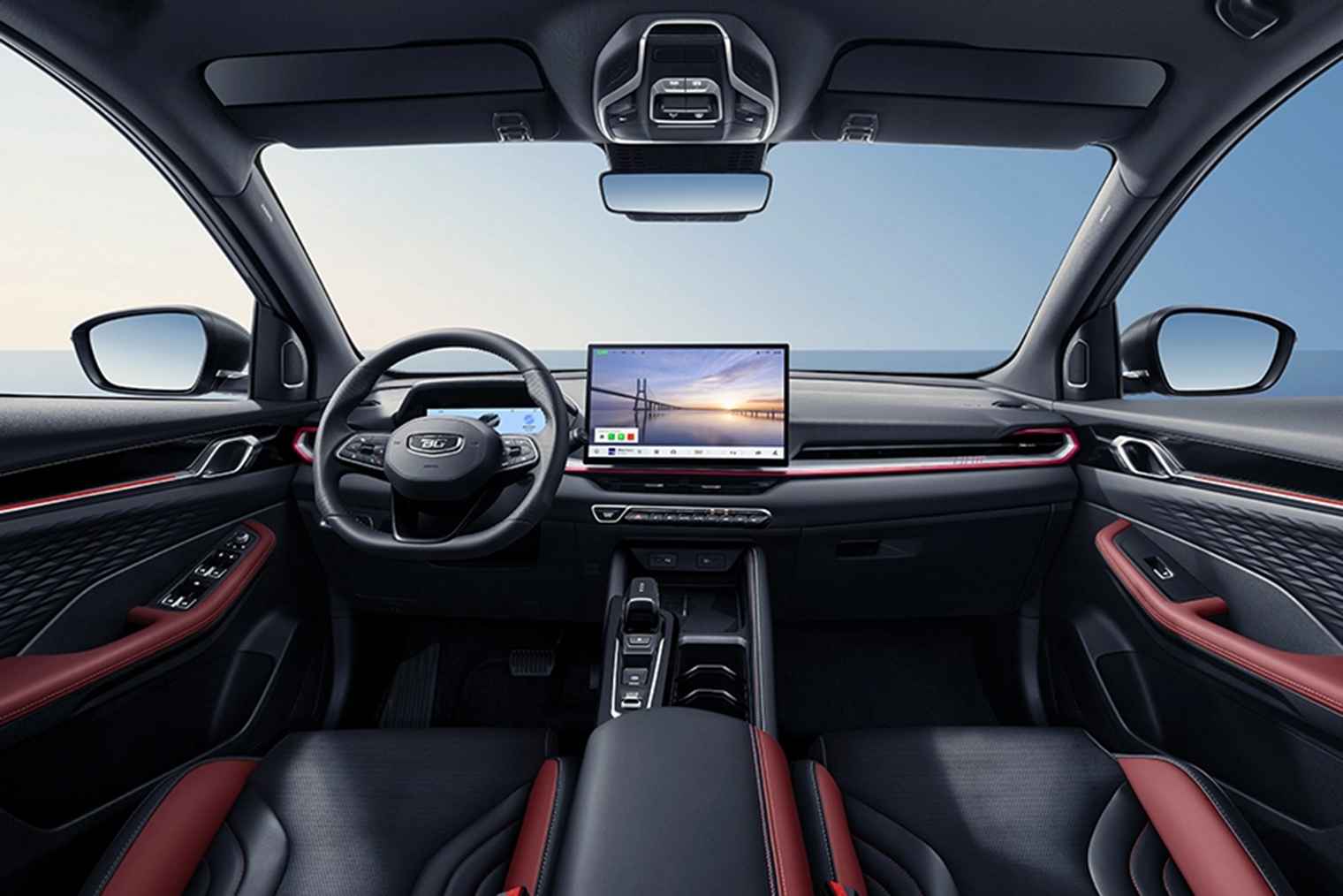 Салон. Поменяли компоновку торпедо и центрального тоннеля. Солнцезащитные козырьки — с тонированным стеклом, как в Geely Atlas. Обивка сидений — экокожа.