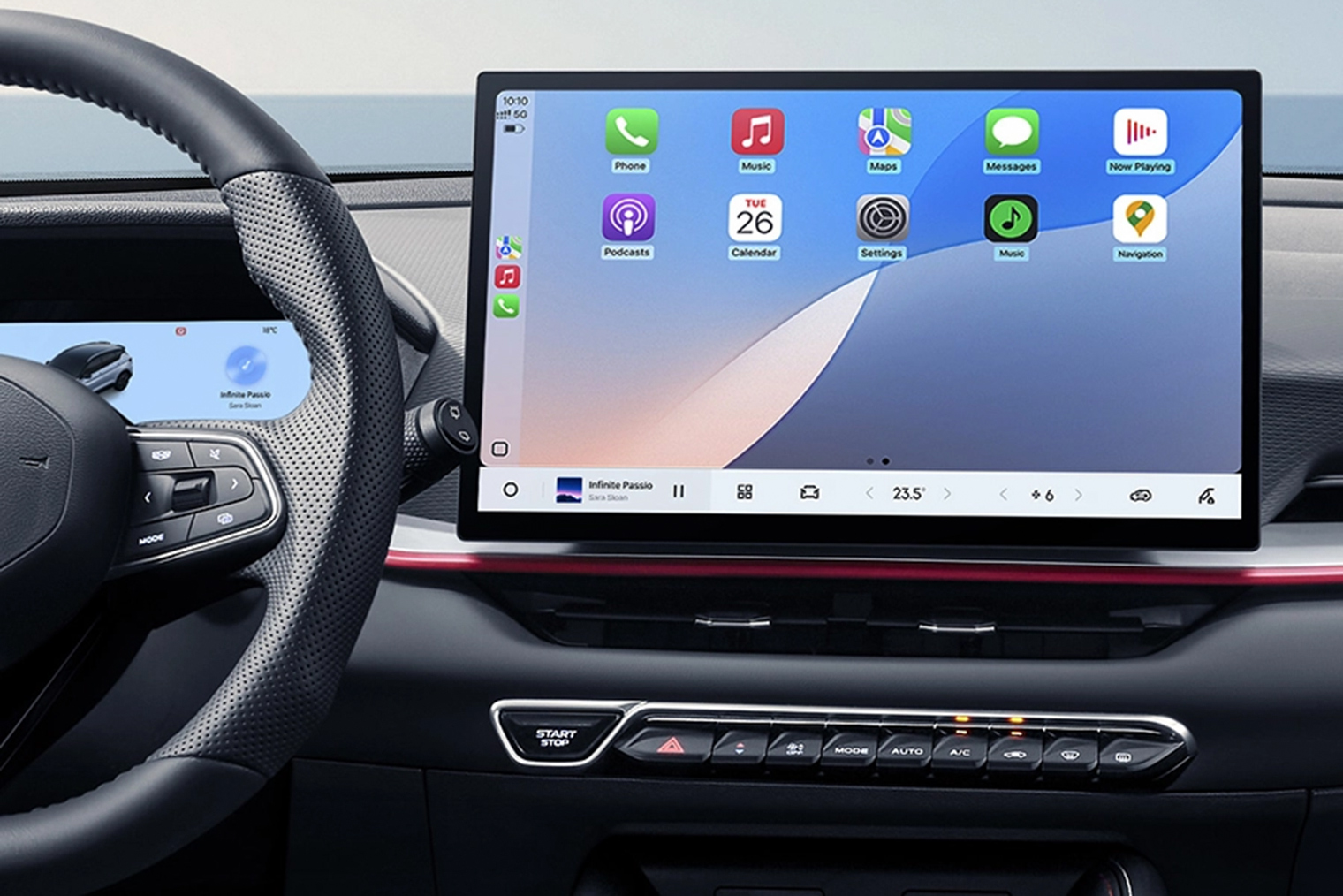 Экран мультимедийной системы — отдельный, диагональю 14,6 дюйма . Приборная панель водителя — цифровая, с отдельным козырьком и диагональю 8,8 дюйма. Кнопки климат-контроля — физические.