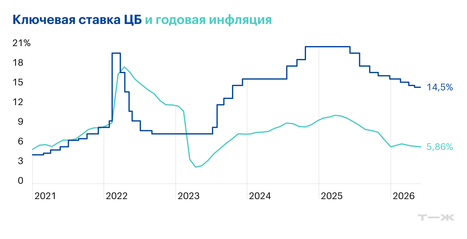 В апреле регулятор сузил диапазон средней ключевой ставки на 2026 год до 14—14,5 против 13,5—14,5% в феврале. В то же время диапазон на 2027 год расширили — с 8—9 до 8—10%. То есть прогноз стал чуть более пессимистичным.