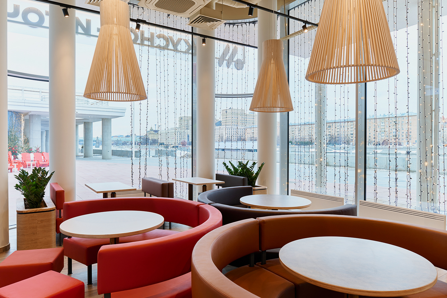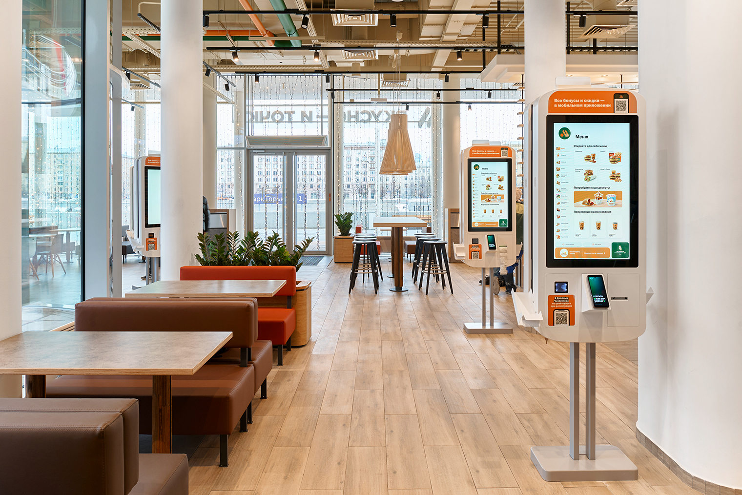 В новом флагмане предусмотрен бесконтактный формат: гости смогут оформить заказ через киоски самообслуживания или мобильное приложение сети. Доставлять заказы к столам станут роботы-помощники, которые также будут поддерживать чистоту в зале.