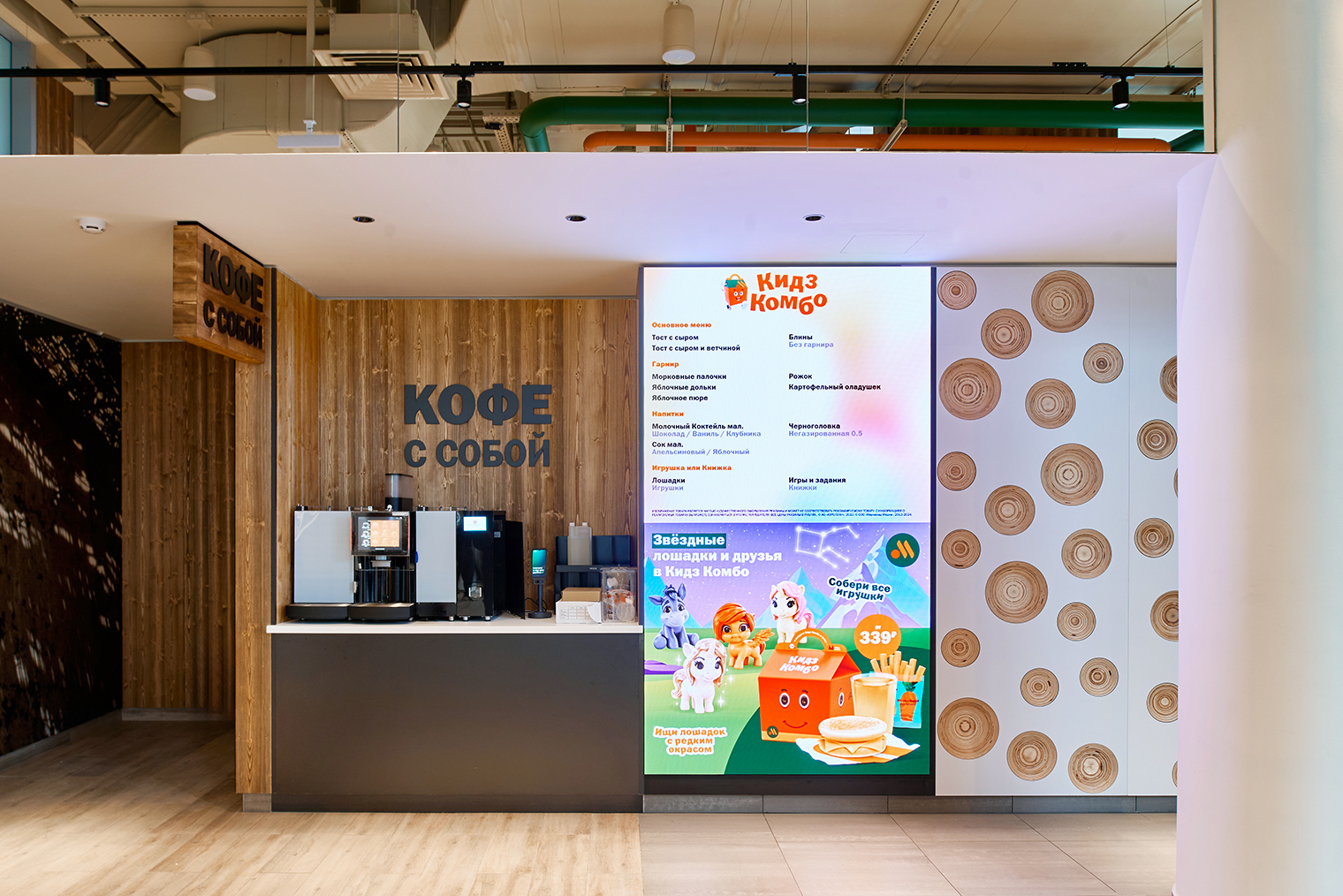 Кроме основного меню в ресторане появится отдельная зона кафе с премиальными напитками и десертами. Также откроется станция самообслуживания, где посетители смогут самостоятельно приготовить кофе: в меню будут доступны американо, латте, капучино и флэт уайт объемом 0,3 л. По желанию к напитку можно добавить сироп.
