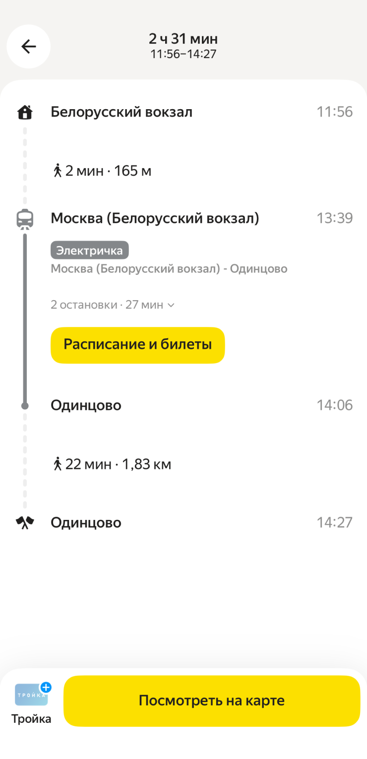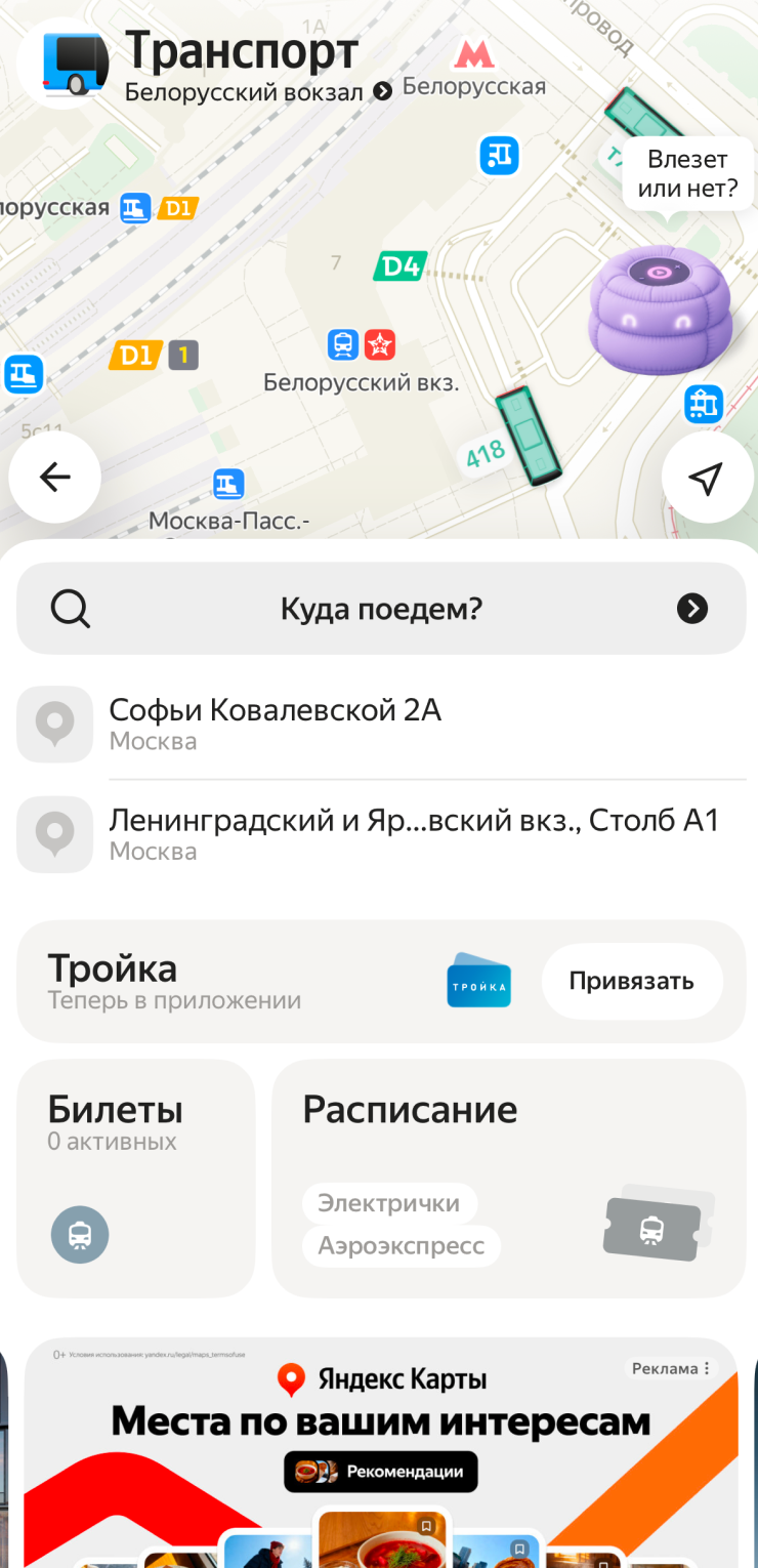 Также в «Яндекс Go» можно построить маршрут с учетом поездки на электричке, пополнить карту «Тройка» и купить билет на «Аэроэкспресс».