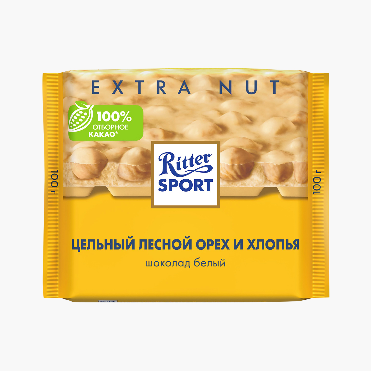 Очень люблю белый шоколад, и сложно найти что-то лучше Ritter Sport. Крупные орехи, хрустящие хлопья, молочный вкус — осторожно, можно умять за раз! :)
