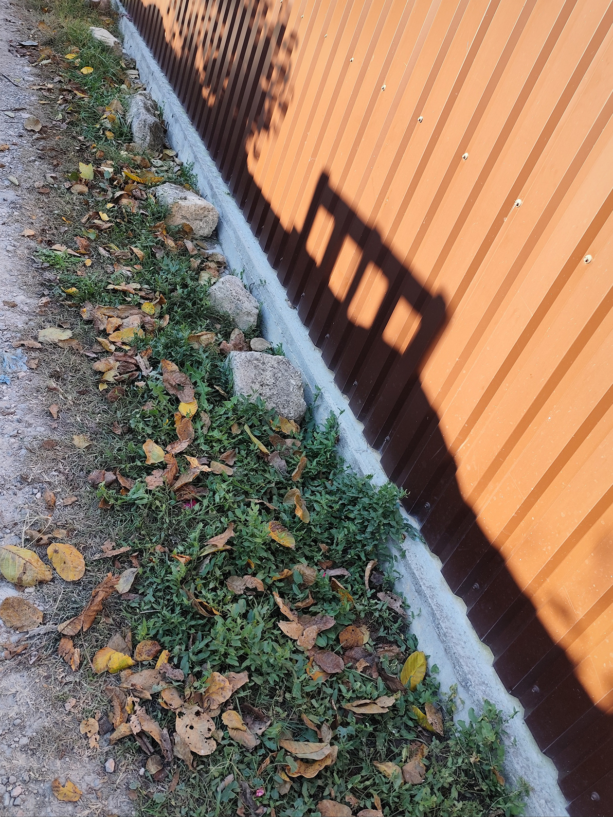 Когда устанавливают такой забор без фундамента, между ним и землей остается небольшое пустое пространство. Некоторые закрывают эту щель камнями или прикапывают грунтом. Мы положили с внутренней стороны участка бетонные столбы, оставшиеся от старого забора.