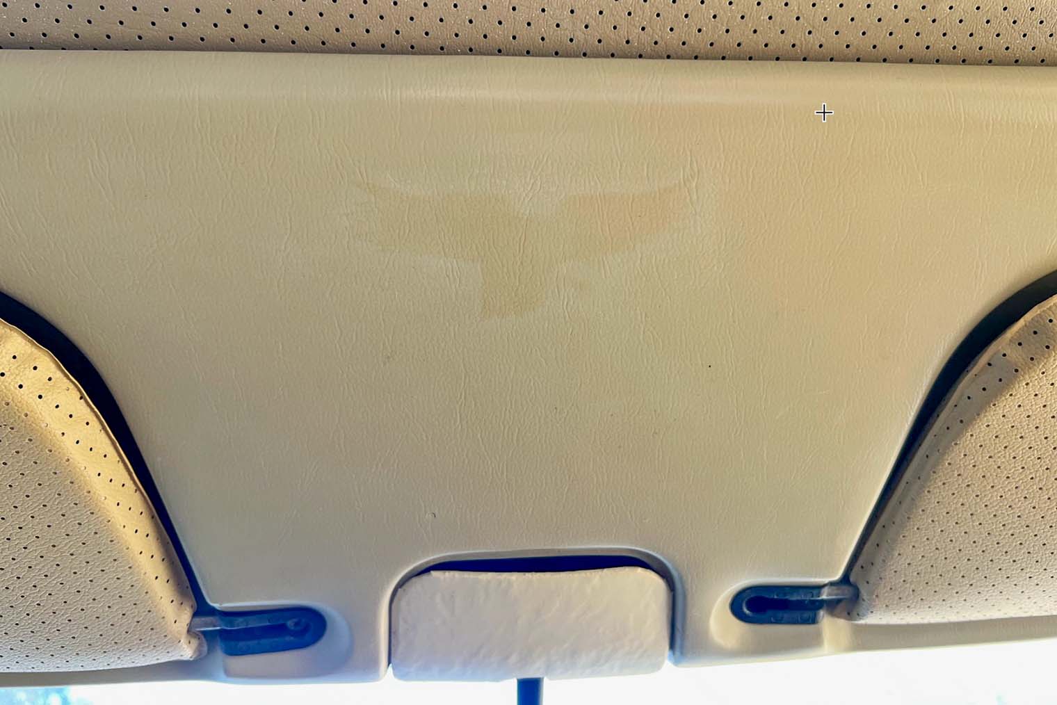 Отмыли потолок. Тогда же решили снять защитную панель на потолке, которая фиксирует солнцезащитные козырьки, и отмыть ее с мылом. Прошлый хозяин наклеил на нее стикер с орлом, который въелся настолько, что даже после удаления на панели осталось изображение птицы. Не помогли ни мыло, ни средство для мытья посуды, ни универсальная химия для удаления грязи.
