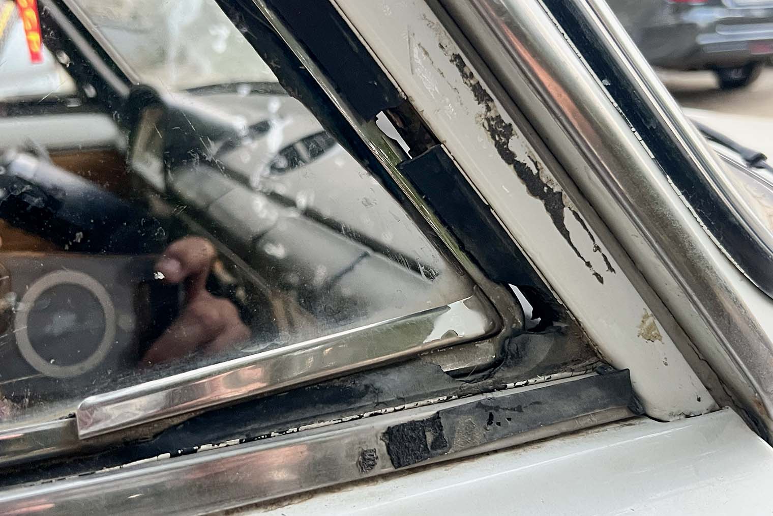Демонтировали салон. Сняли руль, панель приборов, торпедо, новодельную «бороду» с автомагнитолой. Изнанка машины оказалась лучше, чем я ожидал. Я боялся, что под торпедо меня ждет гнилая рамка лобового стекла, но все было целым. Только справа в районе стойки нашелся очаг коррозии, который я не смог удалить, — обработал его преобразователем ржавчины с цинком.