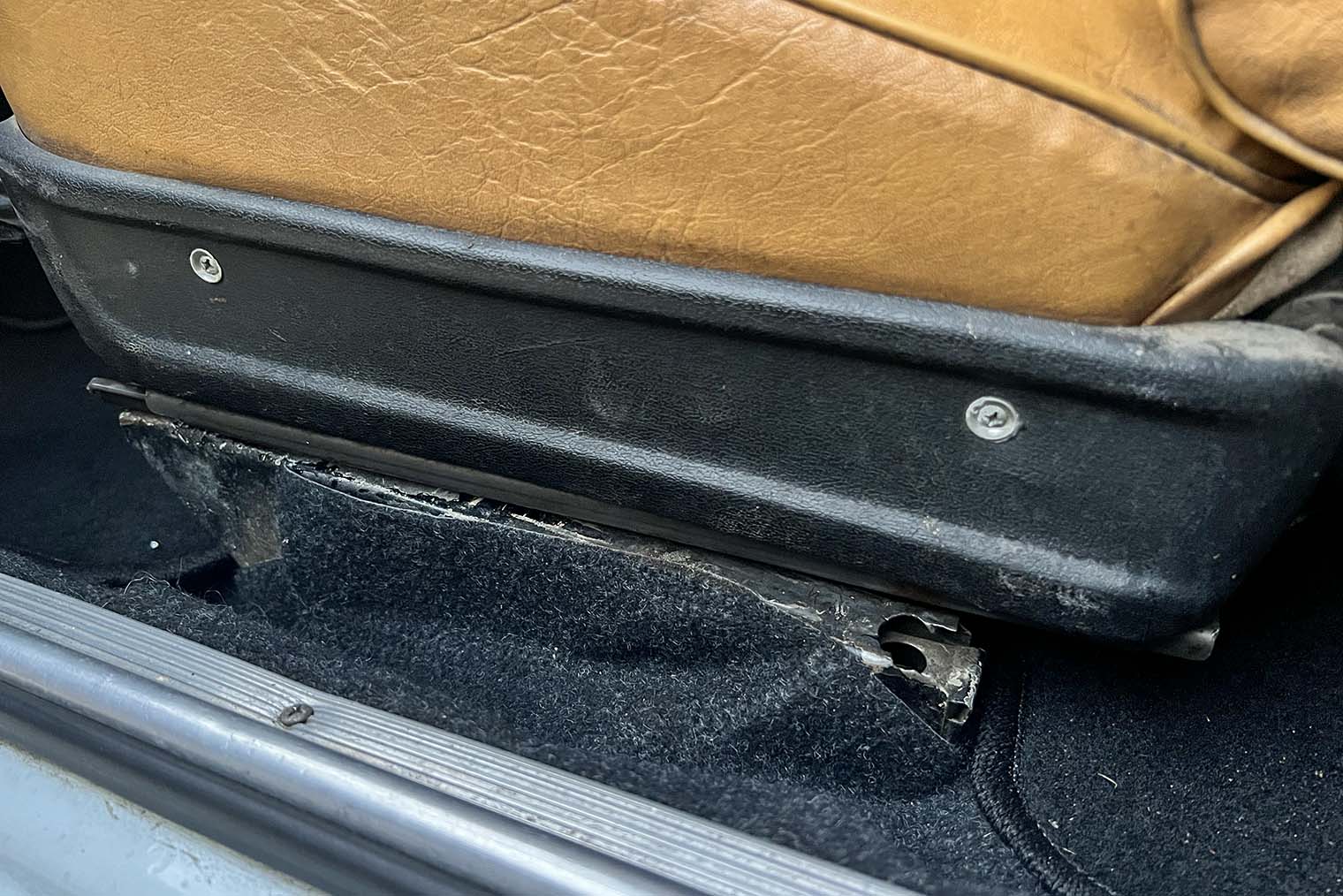 Потом мы сняли сиденья — нестандартные кресла от 2107. Обнаружили, что на водительском кресле выломано крепление заднего левого винта.