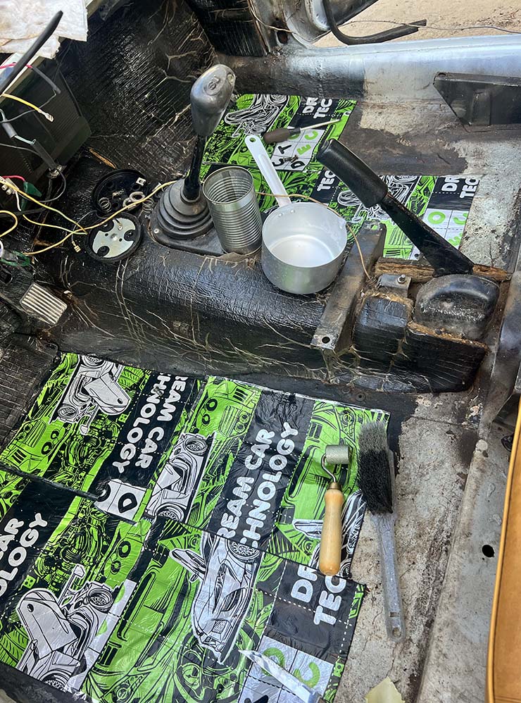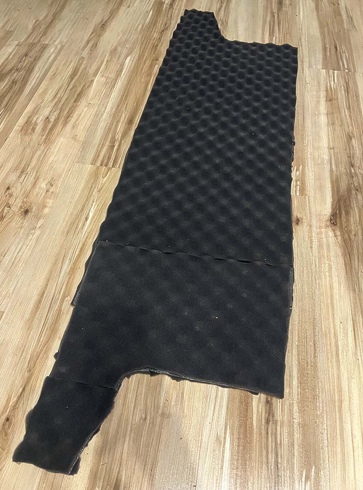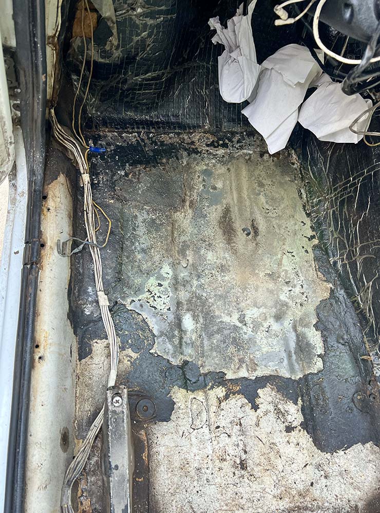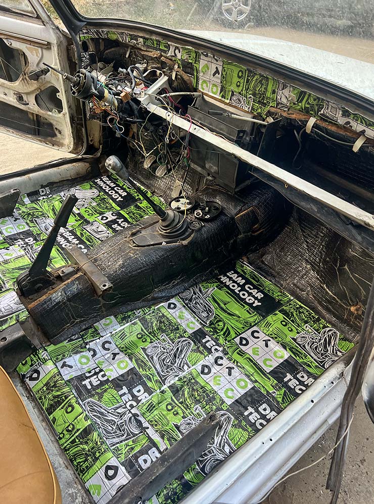 Самое интересное нас ждало на полу. Сначала мы вытащили войлочный пол — кое-где он прогнил, а под ним остался толстый слой уплотнителя, похожего на вату. Местами он был мокрый: видимо, когда в салон попадала вода, она проходила через напольное покрытие и оставалась в этом наполнителе.