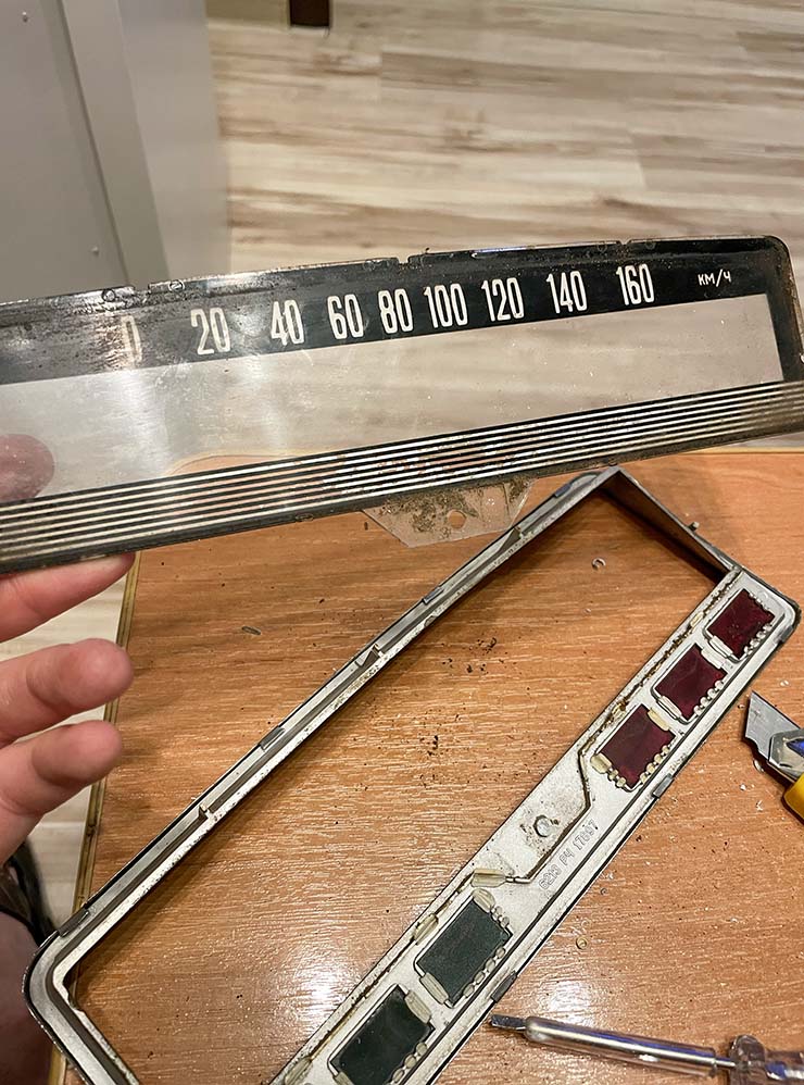 Перебрали приборку и торпедо. Я полностью отмыл шкалы и стрелки, заменил уплотнитель, поменял неработающую плату на перепаянную, которая стояла в моей Копейке. С торпедо тоже пришлось повозиться: светлые вставки облезли и местами не держались. Красить их не стал, но пришлось восстанавливать крепления. Использовал специальный паяльник со скобами и наращивал пластиковые фиксаторы суперклеем с содой. Получилось надежно.