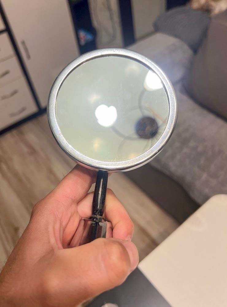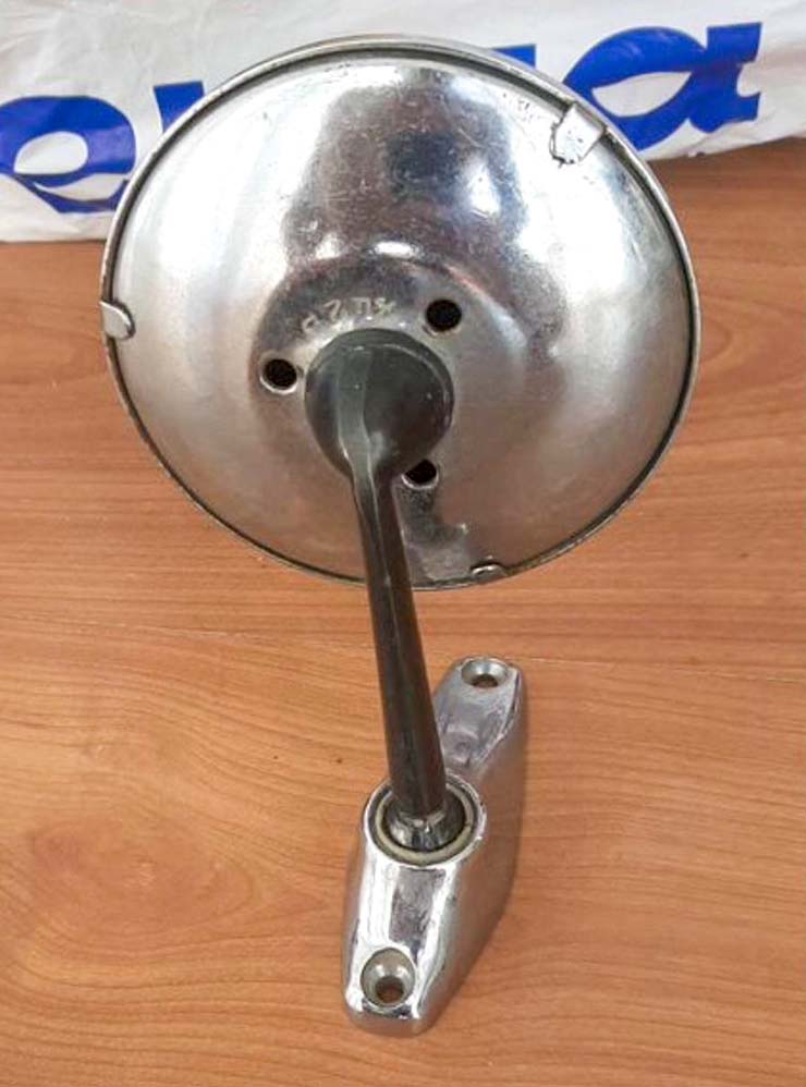Установили зеркало. Я купил на «Авито» хромированное прямоугольное, но в описании неверно указали, что зеркало полностью металлическое. По факту оказалось, что задняя стенка из пластика. Продавец вернул мне половину стоимости, а я выбрал другое зеркало — круглое, металлическое. У него был лопнувший зеркальный элемент — я полностью перебрал всю конструкцию, вычистил коррозию, отполировал хром. Зеркальный элемент заменил на новый, но он оказался непанорамным. Теперь у меня есть красивое зеркало, в которое ничего не видно.