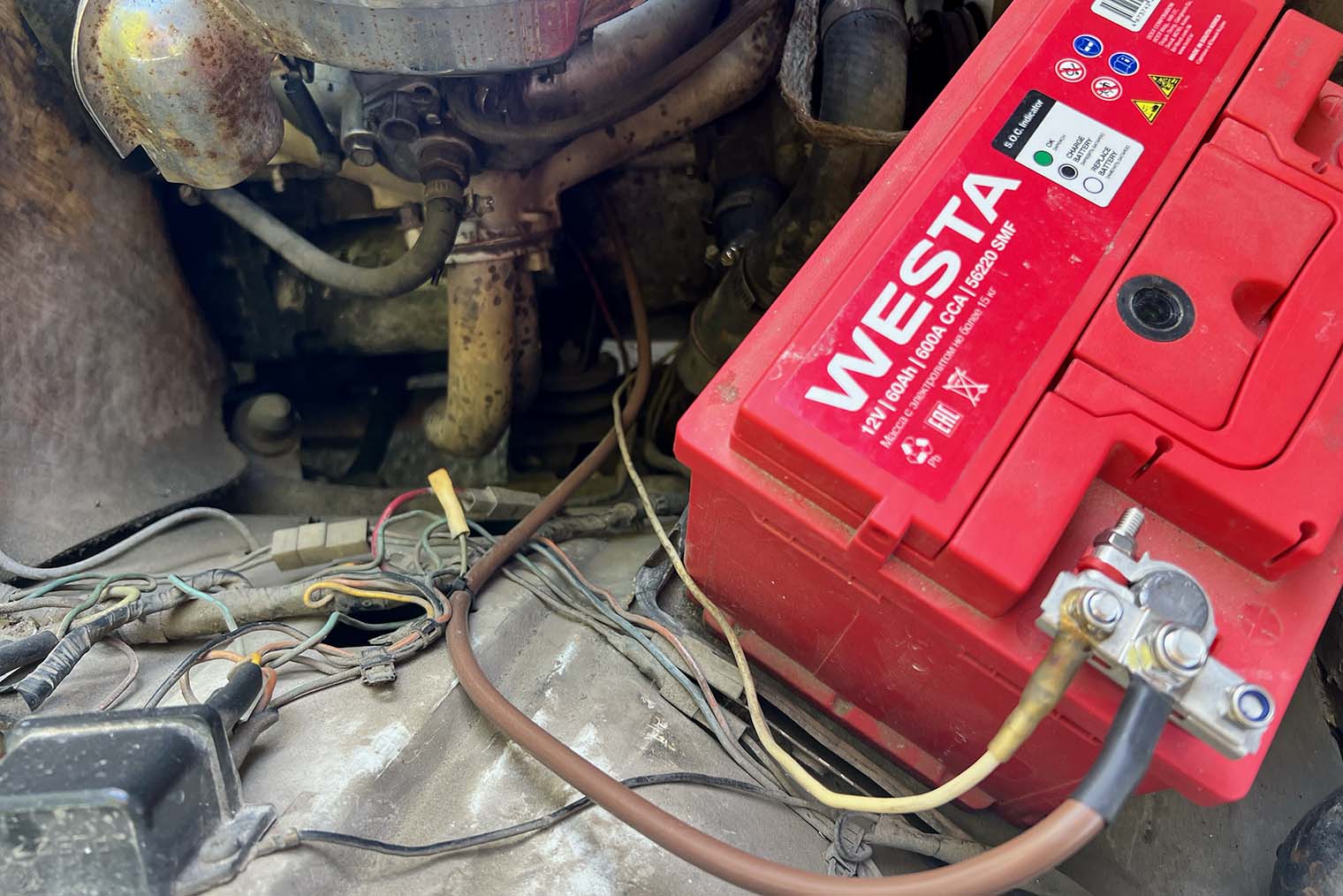 Заменили кабель плюсовой клеммы. Кабель, который идет от стартера к плюсовой клемме, лег на коллектор и прогорел. Заменили его сами, на это ушло три дня. Сначала мы сняли воздушный фильтр, затем отсоединили впускной коллектор вместе с карбюратором и добрались до стартера. Починить можно было и быстрее, но мы делали все впервые, и иногда под рукой просто не было нужного инструмента.