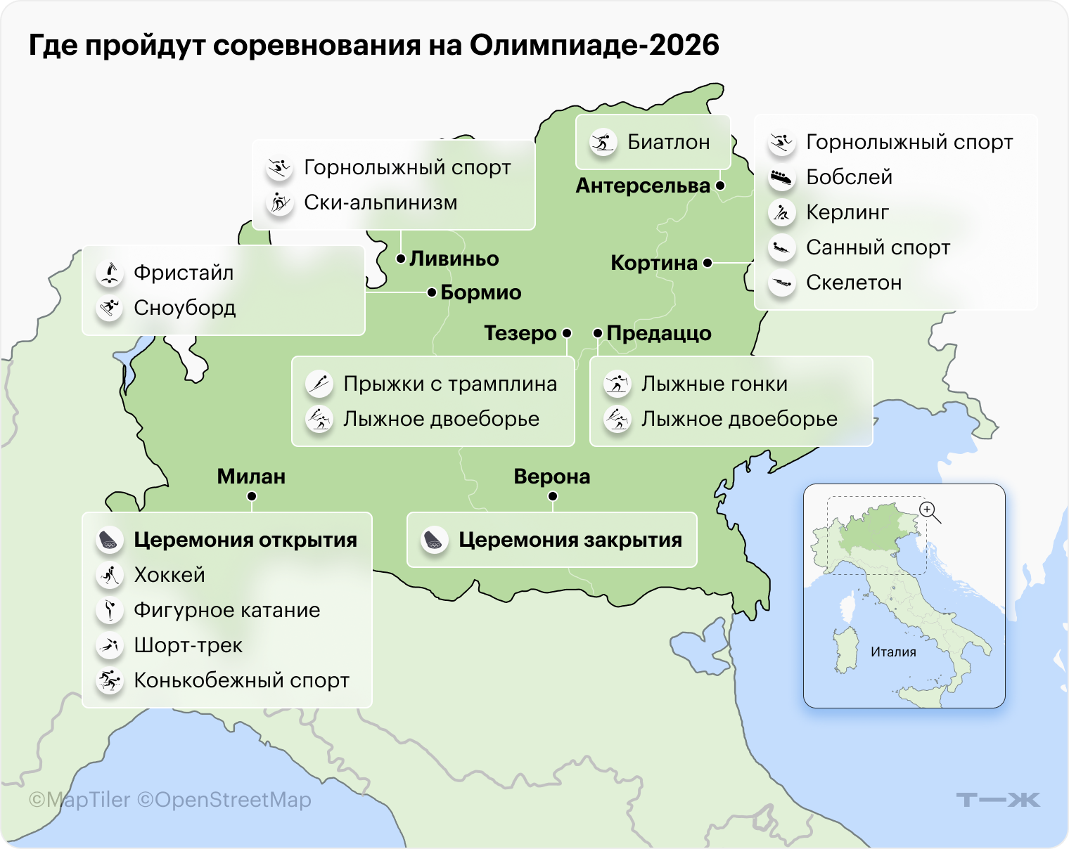 Хотя заявлено, что Олимпиада-2026 пройдет в Милане и Кортине-д’Ампеццо, фактически соревнования примут восемь населенных пунктов.