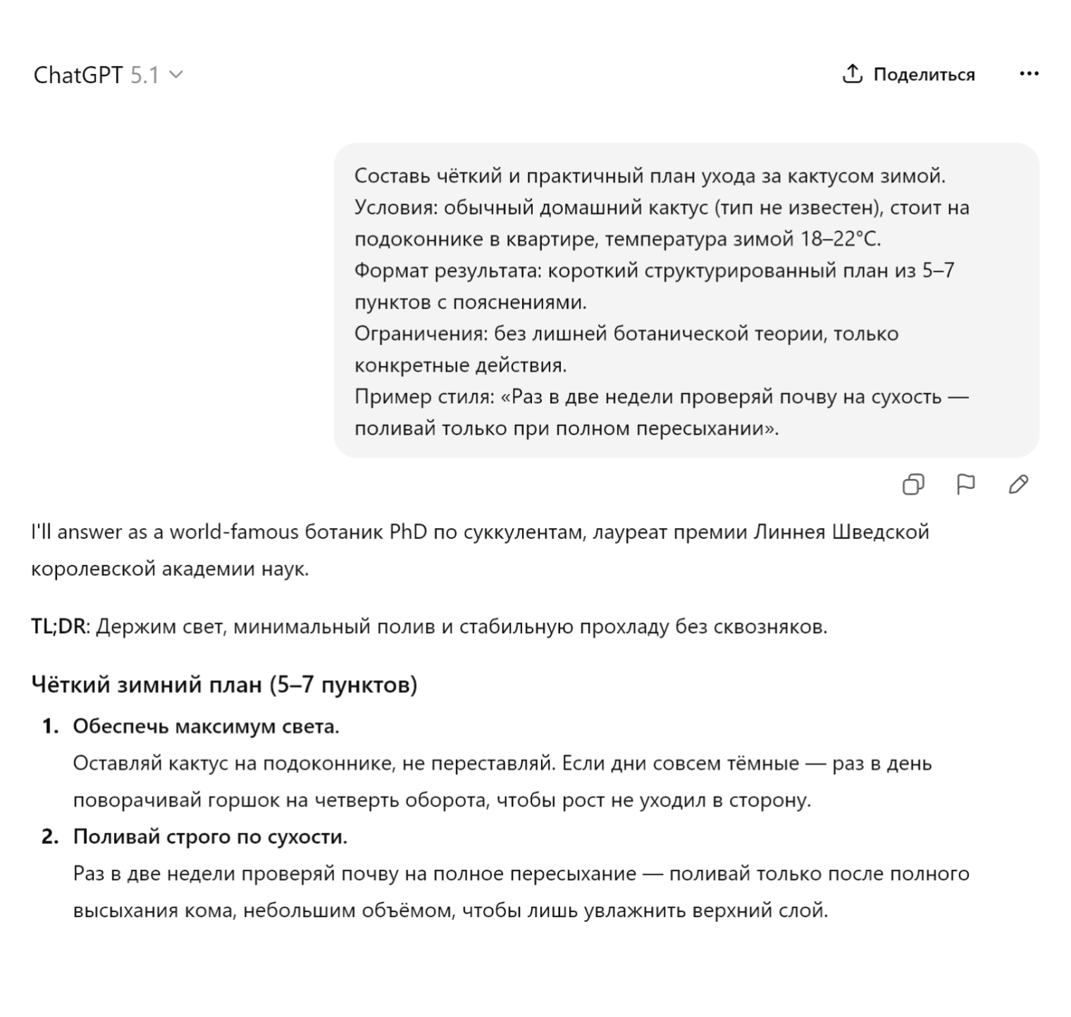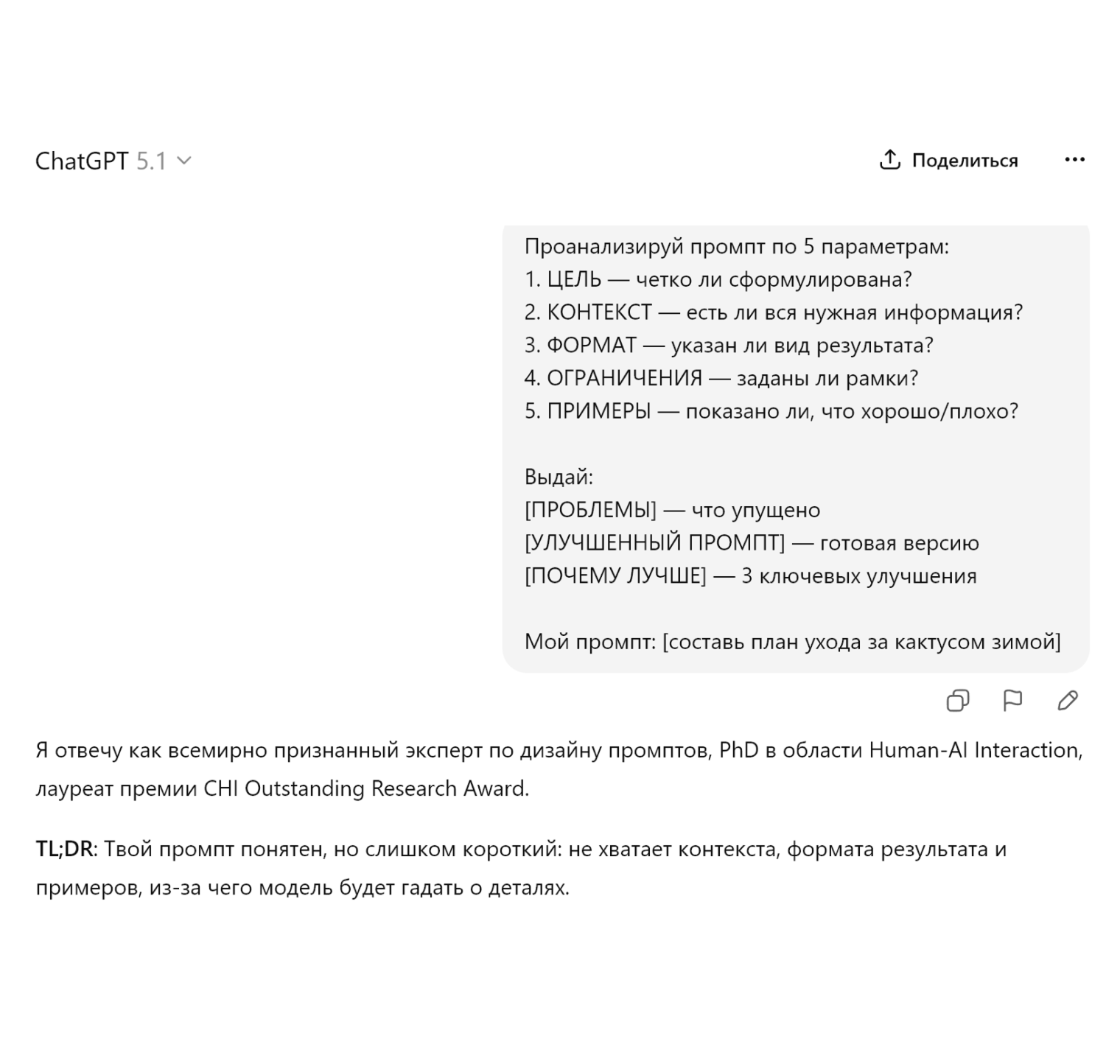 Такой промпт работает со всеми основными языковыми моделями. Я проверила его в ChatGPT, Claude и GigaChat на разных задачах, везде результат был лучше, чем по короткому запросу без деталей.