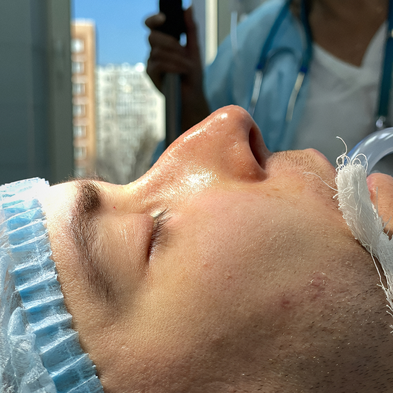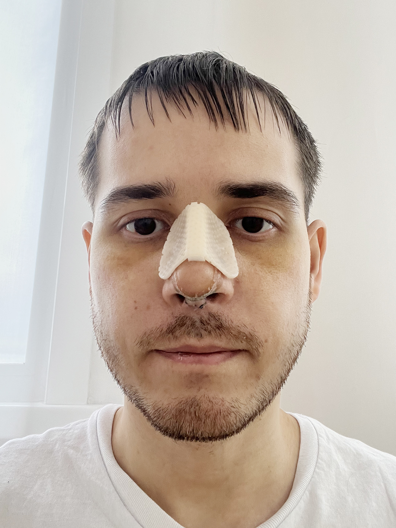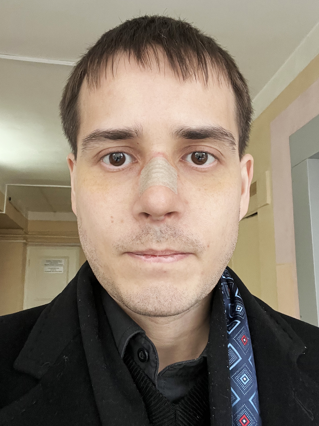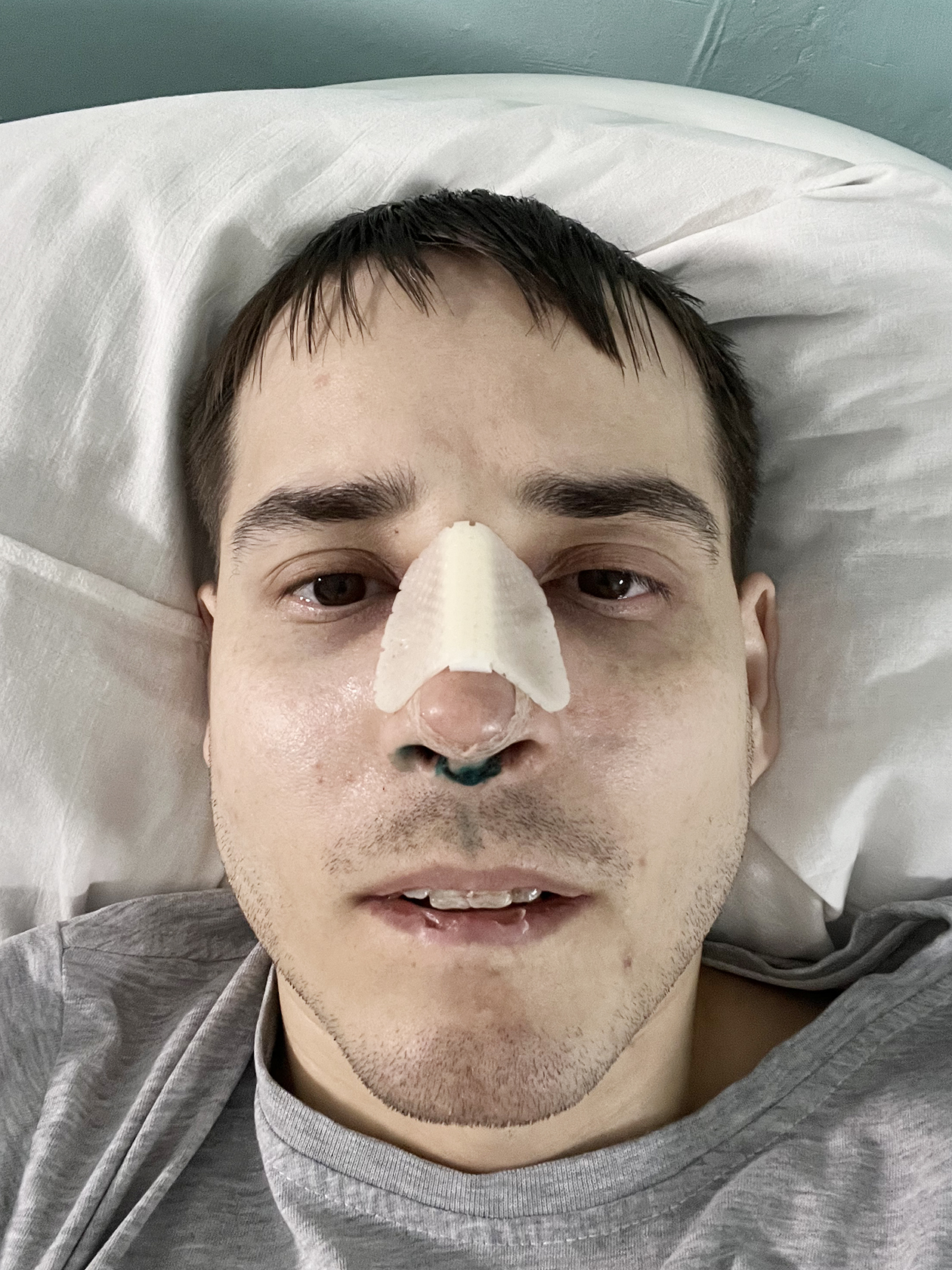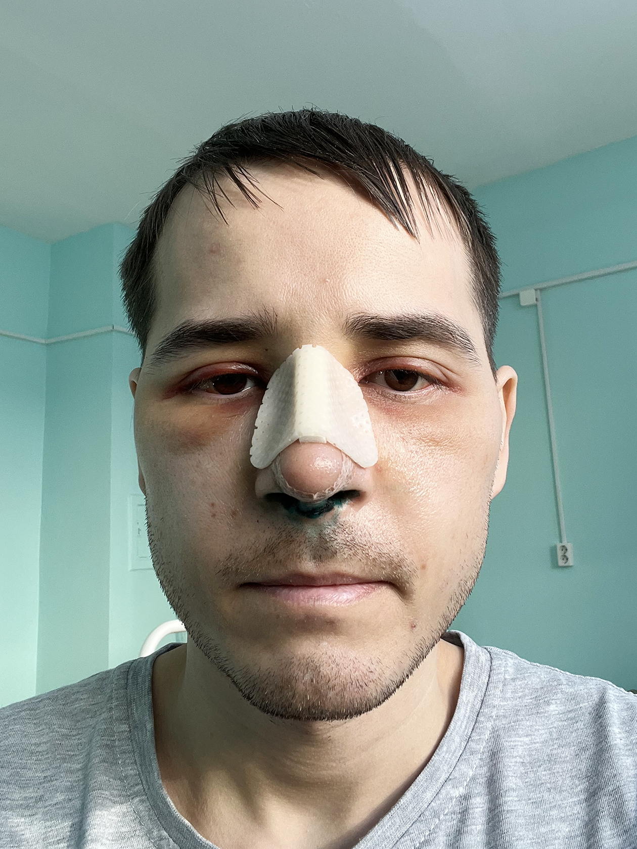 В первые минуты после возвращения в сознание тело слушалось плохо. Помню, что очень хотелось почесать бровь, но сделать это не получалось. В палату меня вернули в 16:20. Нос болел несильно, но общее состояние было слабым. Новый нос я увидеть не мог — нужно было дождаться уменьшения отеков и снятия гипса, а это делают уже после выписки из больницы.