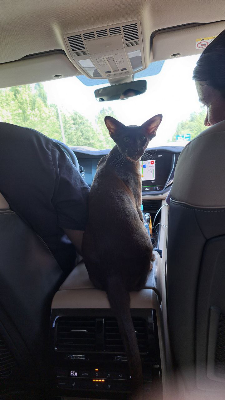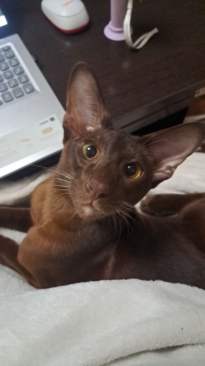 Кот Орион. Порода Ориентал, Возраст 2 года. Любит: играть, мяукать, гулять на даче ( поэтому в шлейке с трек- навигатором). Характер: умный, упертый, вредный. Любит ластиться, но только когда сам захочет. Если не хочет, то выдерается и убегает ( ведёт себя как подросток: ну, мам, не обнимай меня, я уже взрослый). Итог: любимец всей семьи!
