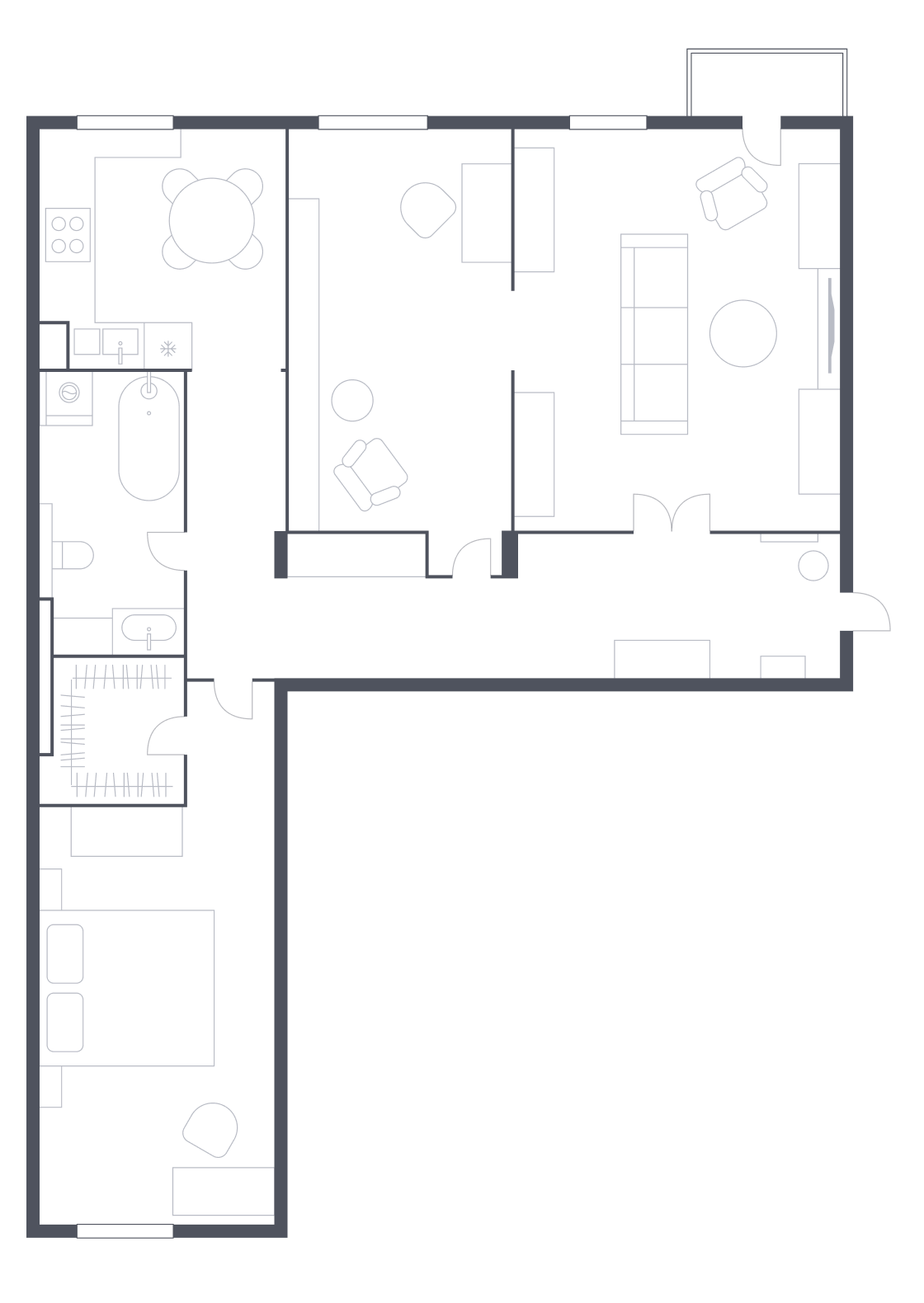Планировку почти не изменили, сохранили длинный коридор. Снесли темную кладовую вместе со встроенным шкафом в спальне — взамен создали гардеробную. Объединили санузел и ванную. Кухню, гостиную и кабинет с библиотекой оставили в прежних габаритах.