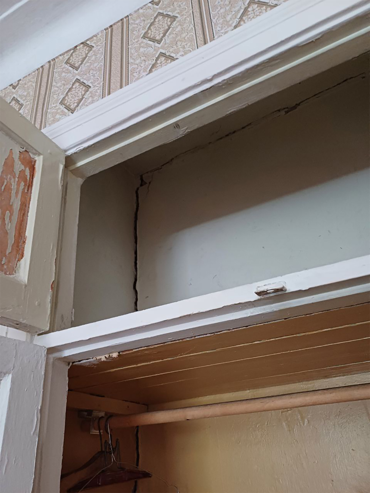 Среди других проблем в глаза бросались трещины на стенах, разница уровней полов и потолков в помещениях, сильная кривизна стен. Паркет тоже был в плохом состоянии, его дополнительно испортили лаком и некачественными красками. На кухне обнаружили три слоя линолеума, под ними — тоже испорченный сгнивший паркет. Единственный плюс — предыдущие владельцы заменили все окна на новые.