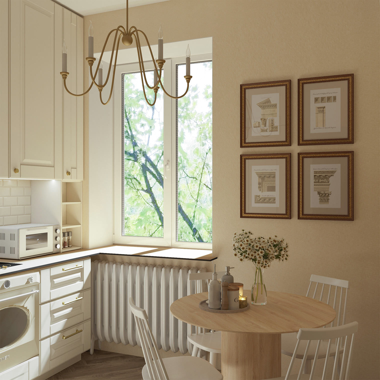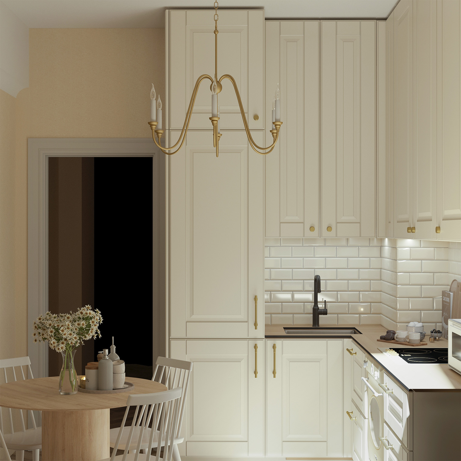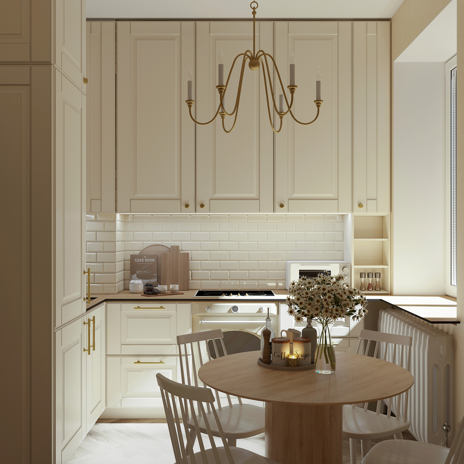 Пока мы временно поставили бюджетную кухню из ЛДСП за 60 000 ₽. Купили ее на маркетплейсе, в «Лемана Про» приобрели столешницу HPL, а на «Авито» — газовую плиту. Со временем планируем сделать гарнитур индивидуально под заказ. Он выходит за рамки бюджета, но на визуализациях ниже уже можно оценить идею.