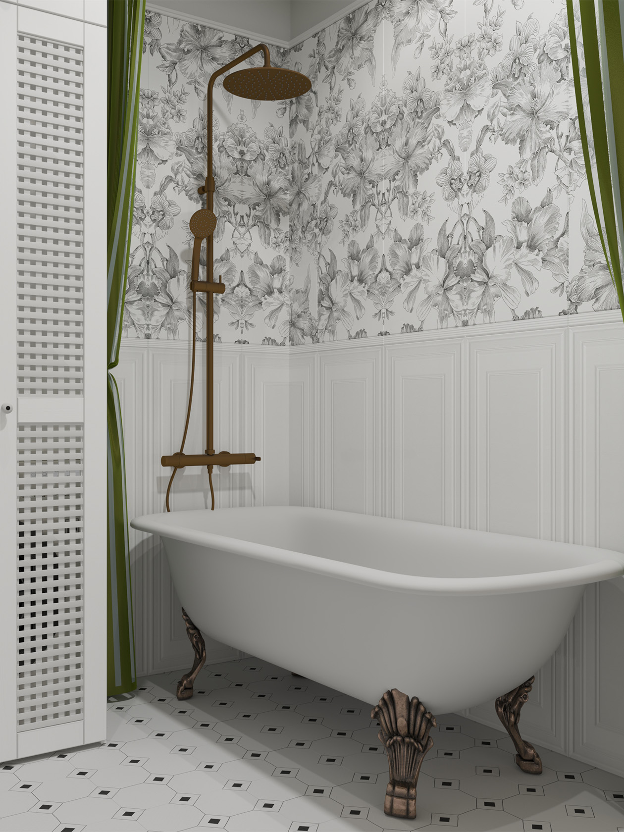 В санузле, как и в гардеробной, сделали натяжной потолок со встроенными светильниками. Белая длинная вертикальная плитка на части стены удачно сочетается с английскими обоями. Небольшой молдинг — завершающий элемент, который выделяет границу на стыке двух этих фактур.
