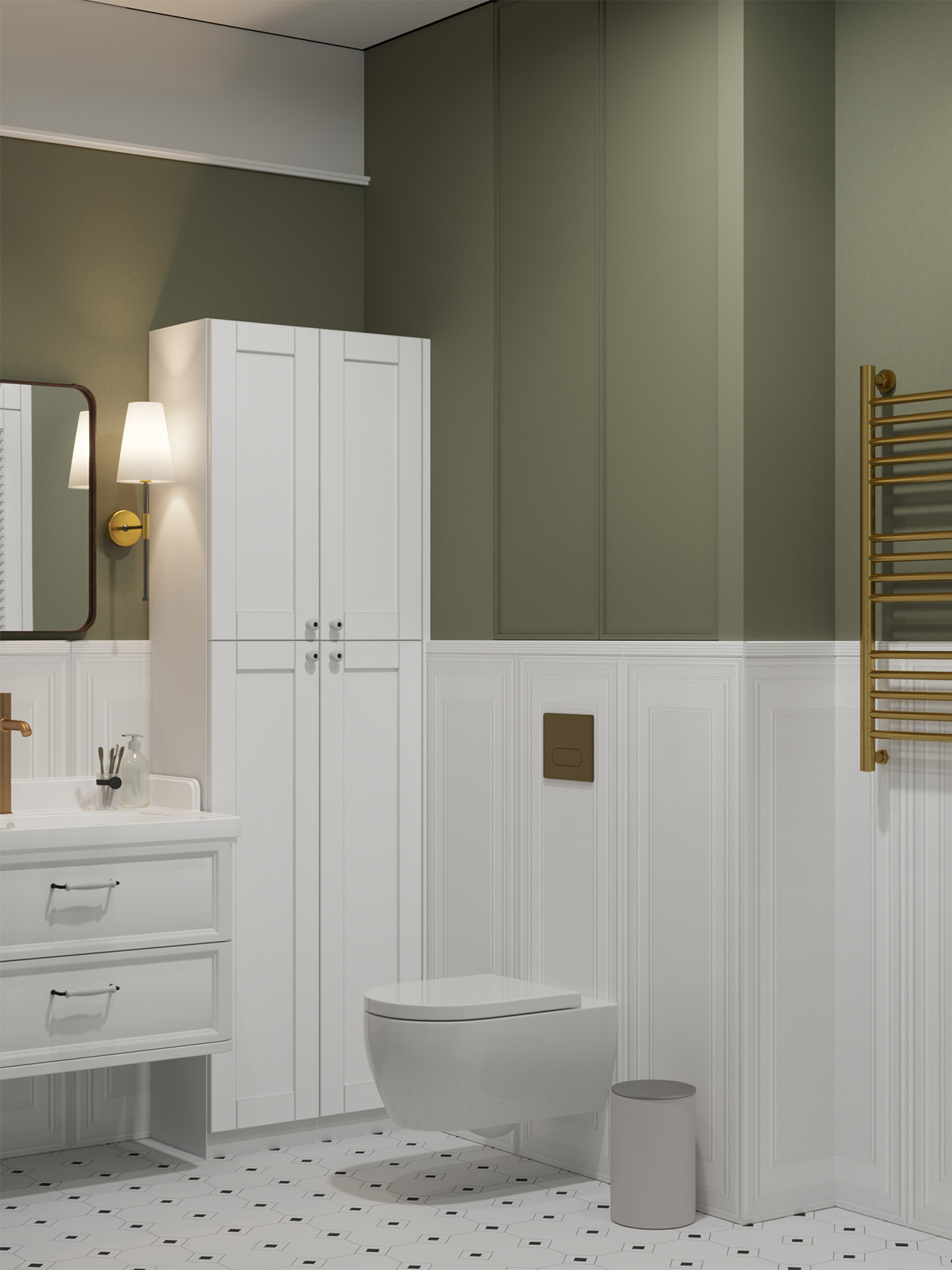 Она осталась небольшой, 7,2 м², и при первом посещении произвела впечатление холодного и мрачного помещения, поэтому в проекте мы использовали теплые светлые оттенки с латунными акцентами.