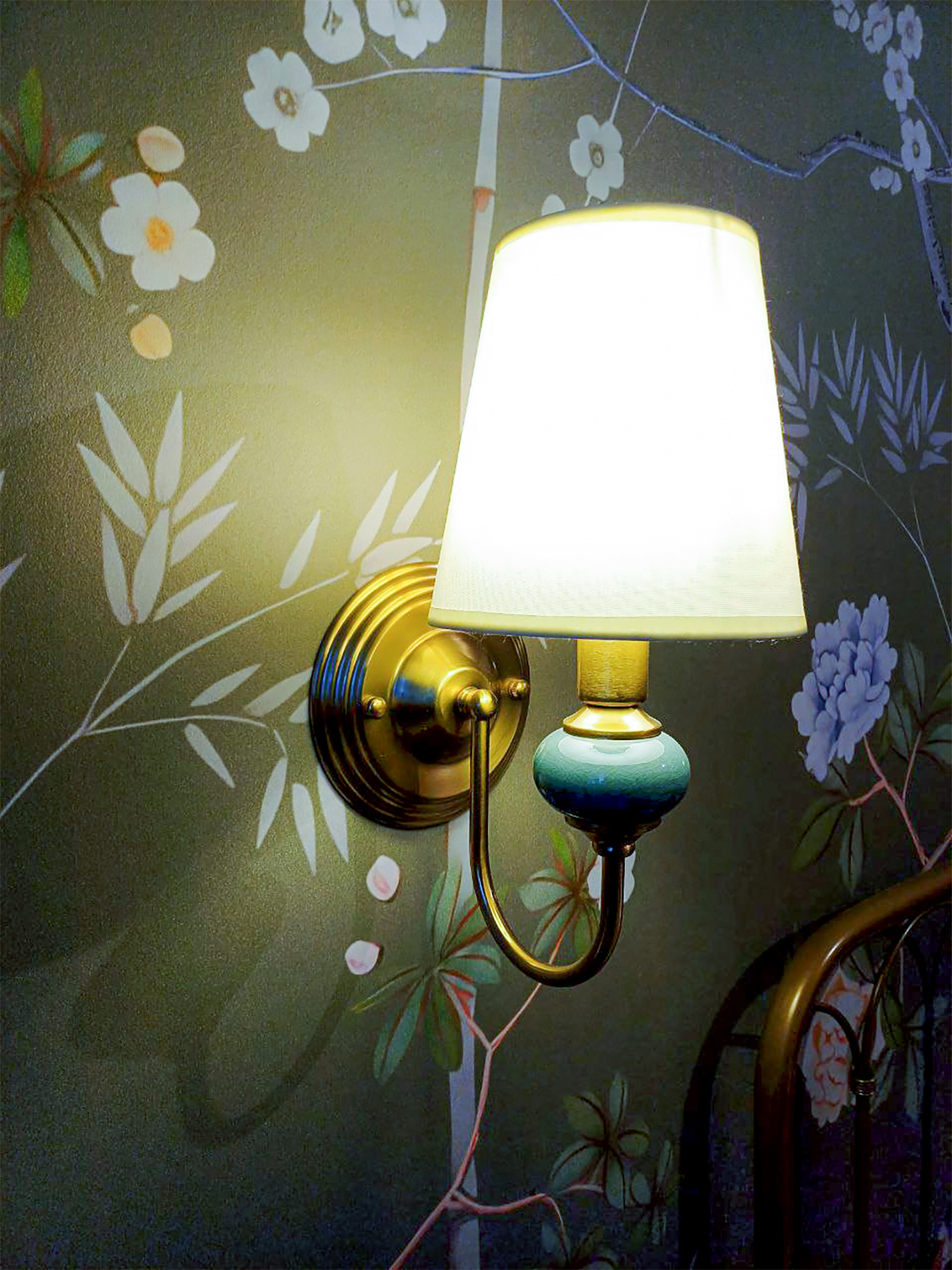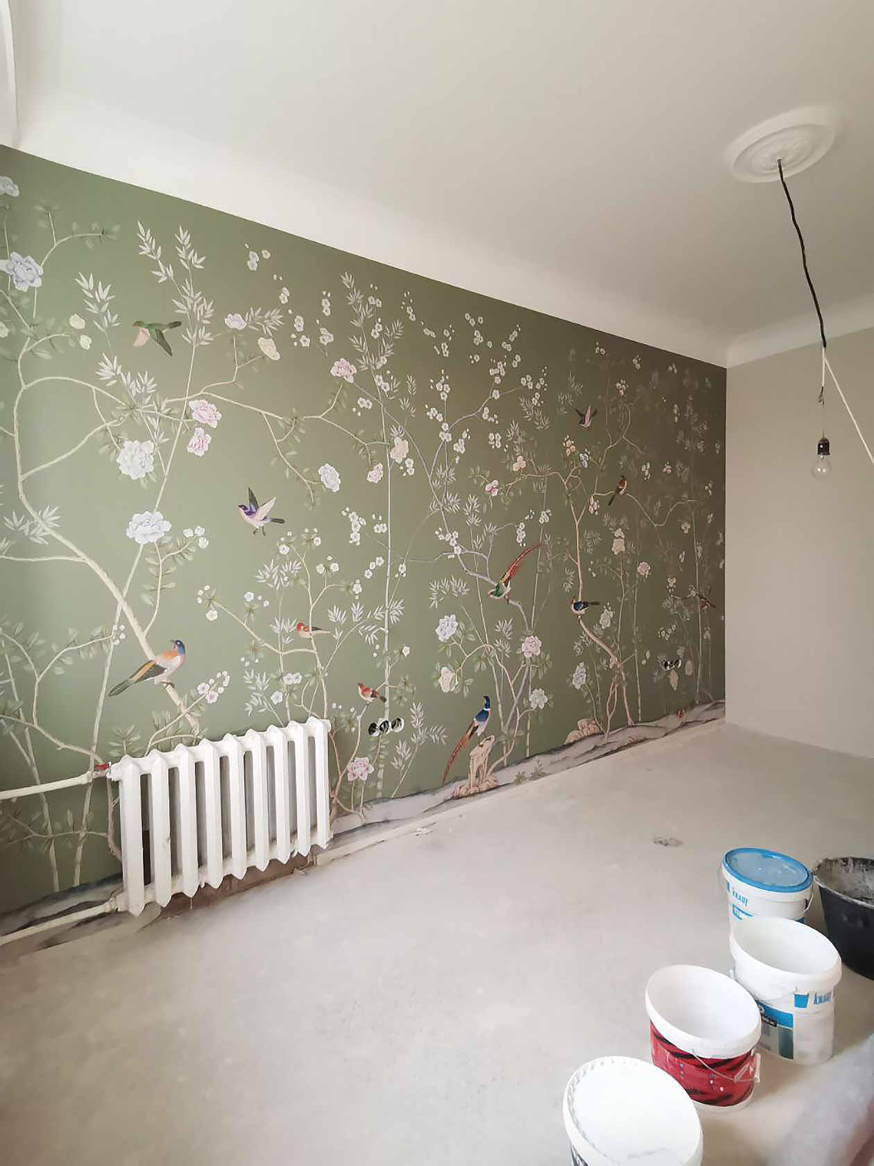 У кровати планировали сделать фреску. В процессе заказчица захотела в этой зоне больше цвета — я подобрала нужный зеленый оттенок и предложила для декора рисунок в стиле шинуазри. Производитель увеличил эскиз без потери качества, прислал разные образцы — мы прикладывали их к стенам спальни и выбрали один из вариантов. Фреска на стену шириной 5,5 м и высотой 3 м обошлась примерно в 20 000 ₽. Ее хорошо дополнили бра с изумрудными вставками.