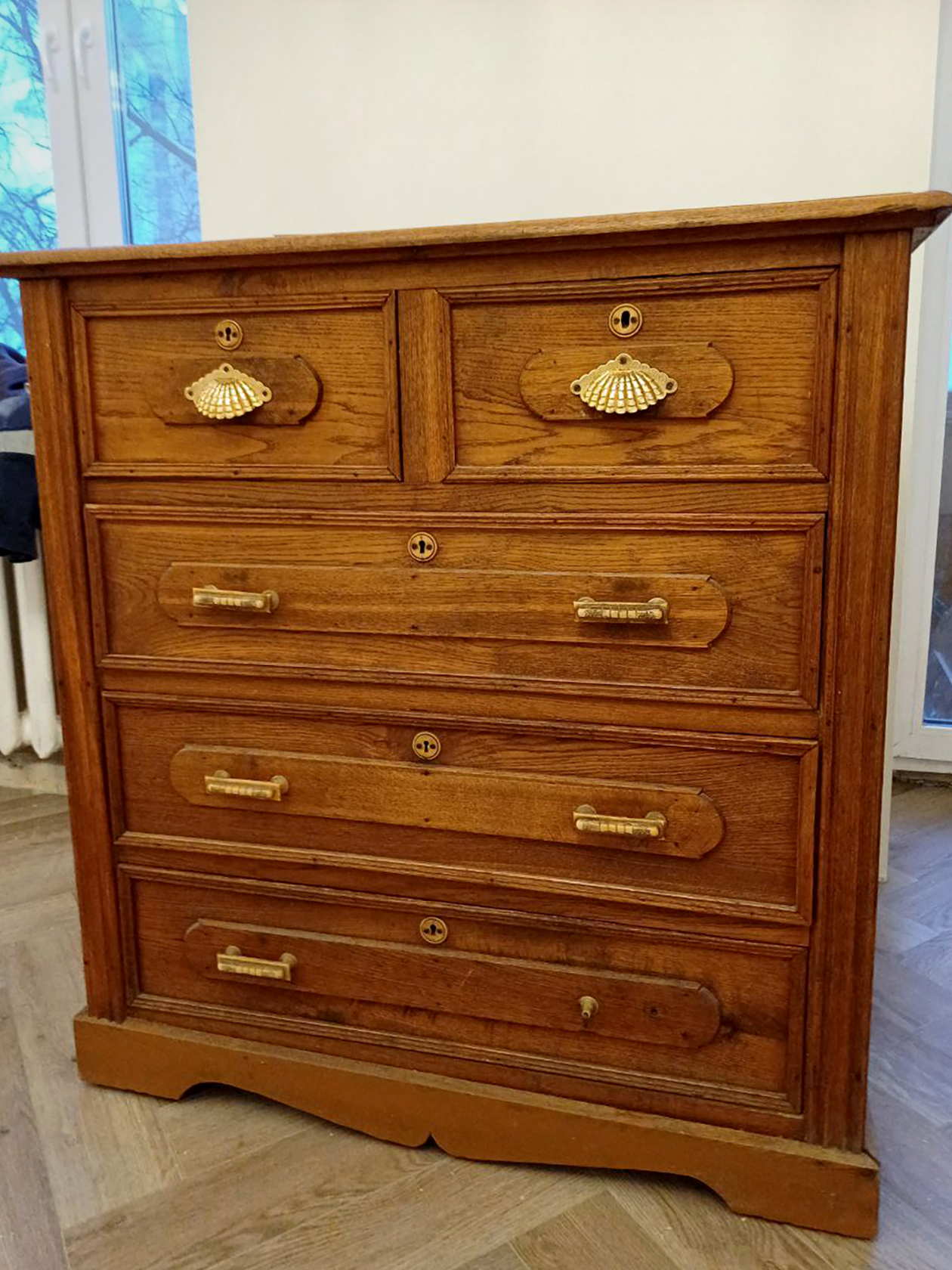 От ротанговой кровати отказались в пользу латунной, которая стоила дешевле. Комод из массива дуба с оригинальными ручками купили на «Авито» за 11 000 ₽. Заказчица хочет сама его отреставрировать.