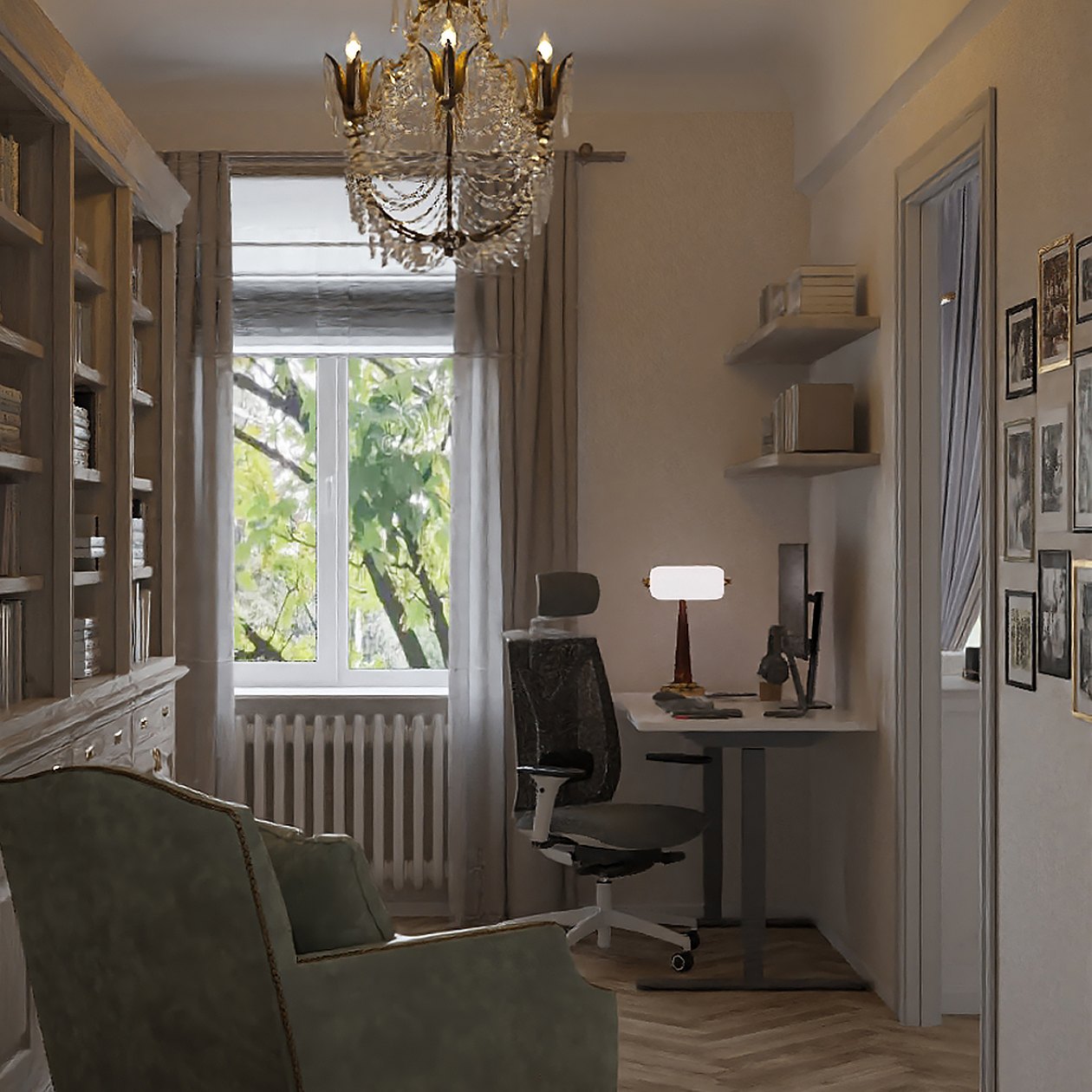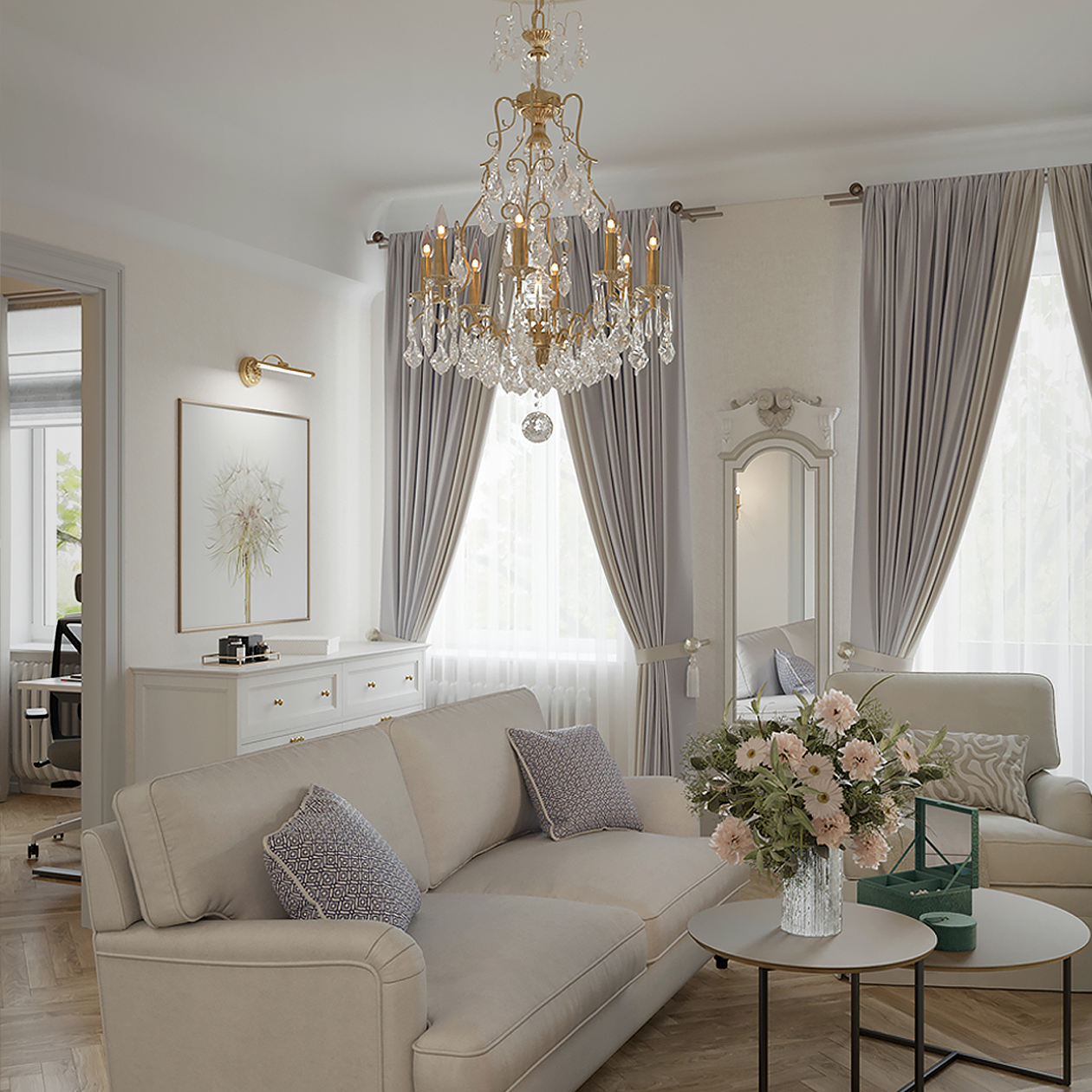 Гостиная и кабинет. В этих помещениях верхним источником освещения служит одна люстра. Даже днем там мало света, поэтому туда выбрали максимально светлые обои оттенка яичной скорлупы. Заказчики предпочитают камерное освещение, и мы добавили бра, торшеры, настольные лампы.