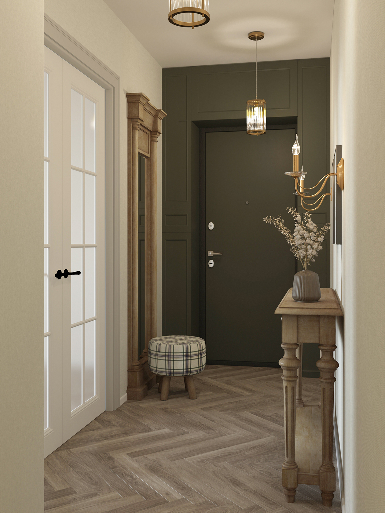 Коридор. В дизайн-проекте мы выделили темным цветом стену с входной дверью. Таким образом длина коридора визуально уменьшилась. Входную дверь обрамили конструкцией с доборами и скрытыми дверцами, за которыми спрячется щиток и ключница, — изготовить такой вариант на заказ стоит до 100 000 ₽.