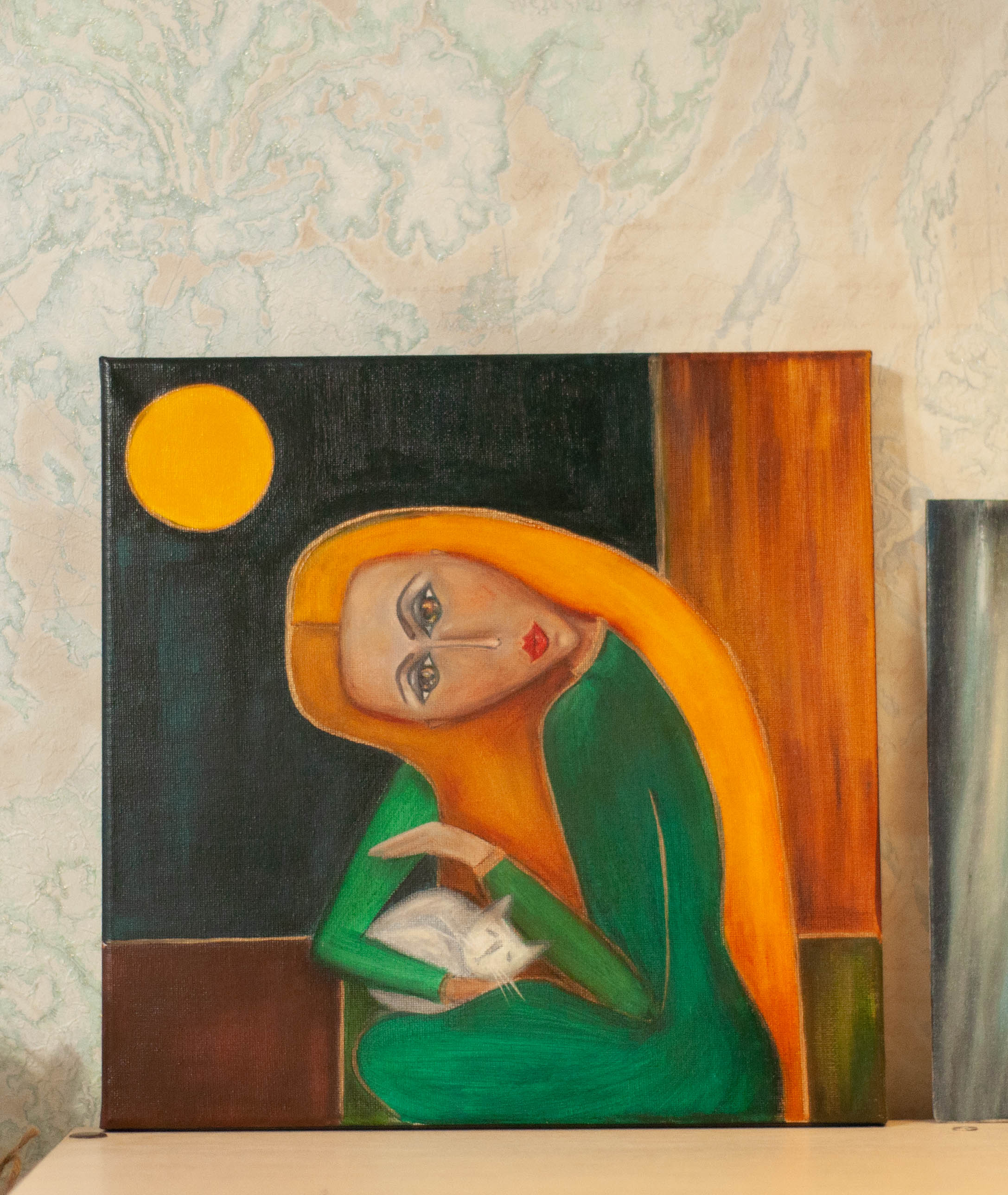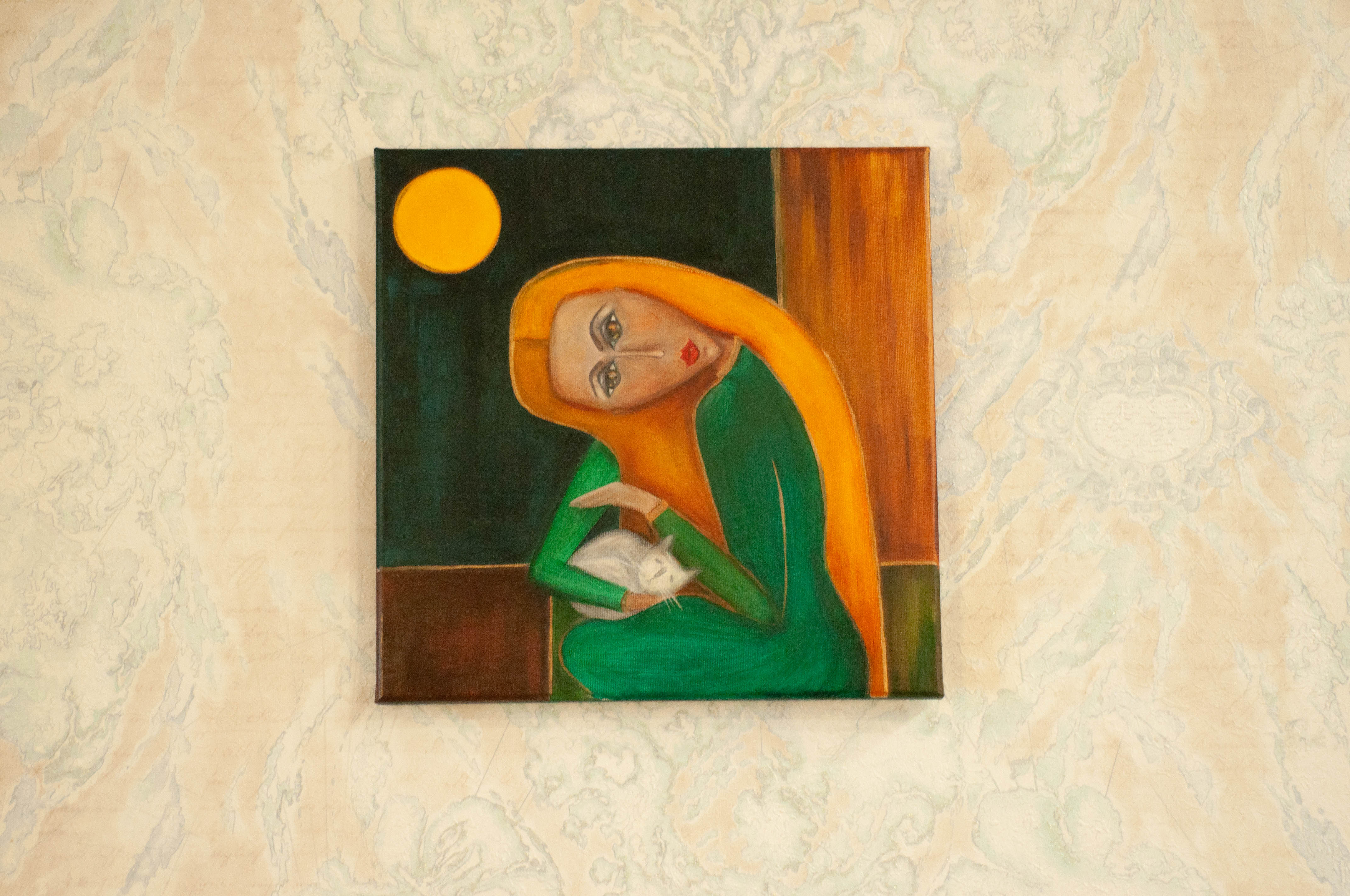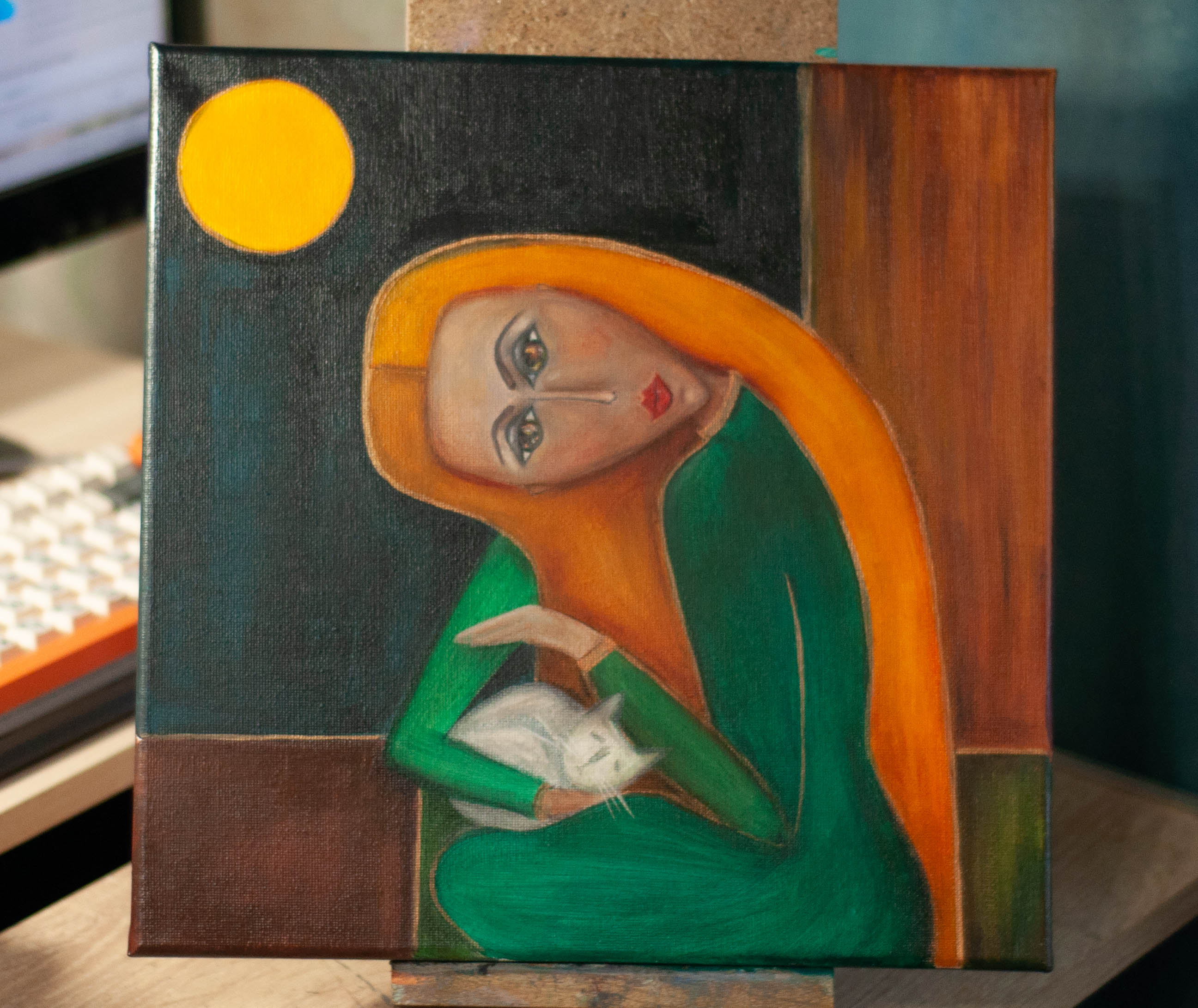 Мой рисунок: девушка с котом на холсте в смешанной технике