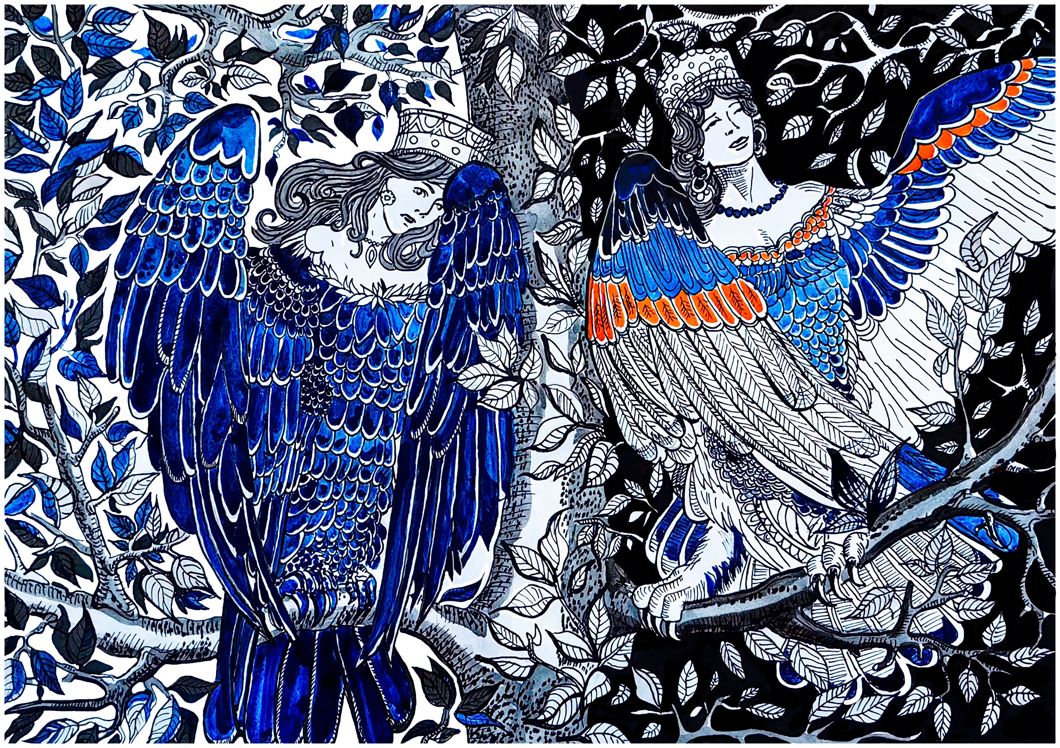 Материалы: формат А3, бумага для черчения, черная и синяя тушь ("Гамма"), оранжевая тушь для акцентов, маркеры и черная гелевая ручка.