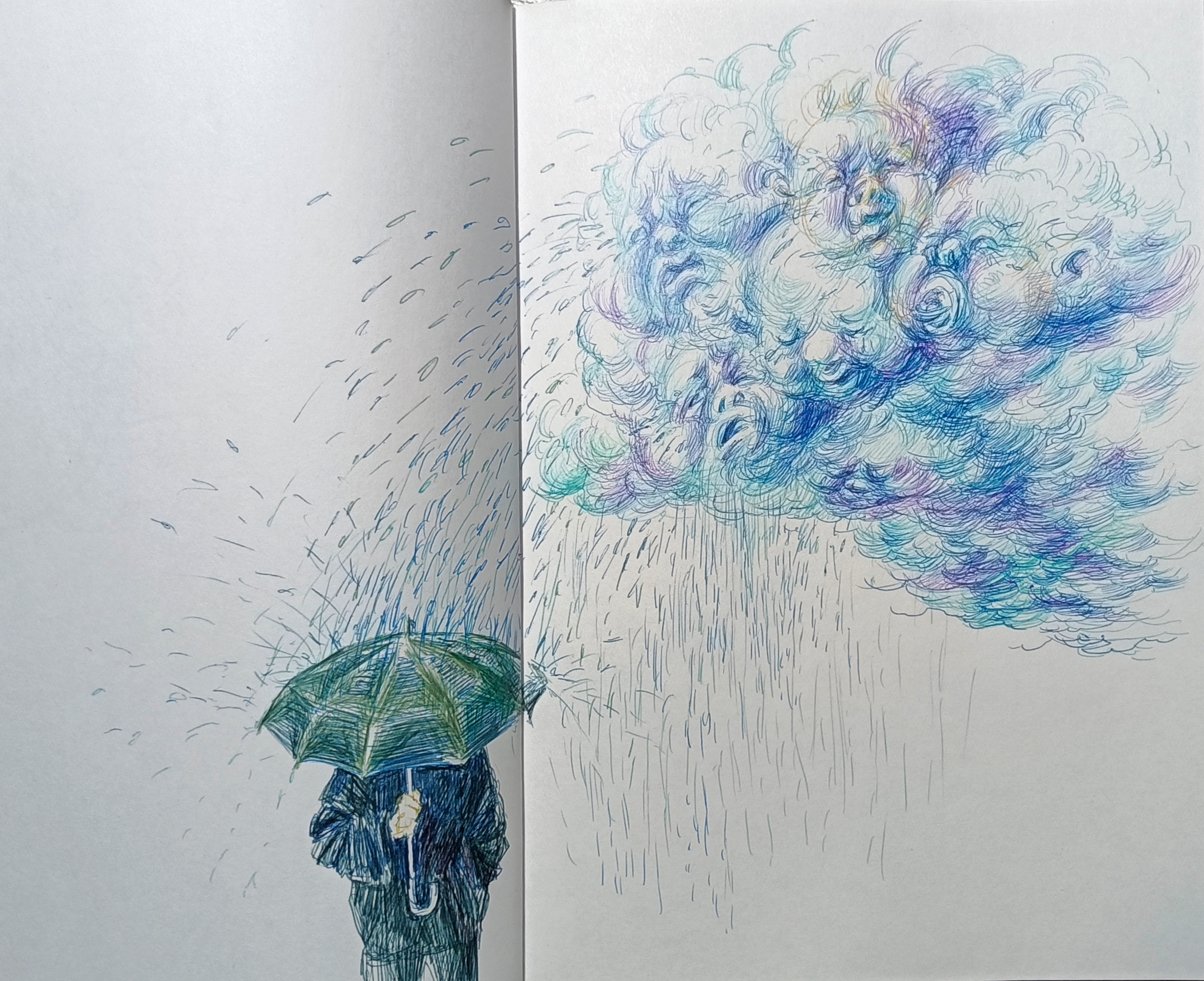 Я постоянно держу под рукой блокноты и зарисовывал в них всё, что приходит в голову — это неплохо развивает воображение. Вот, например, погода испортилась, и мне пришло на ум что облака похожи на щекастых капризных младенцев, и когда они дружно начинали реветь — пора зонт открывать. В этот раз под руку попалась шариковая ручка на 10 цветов.