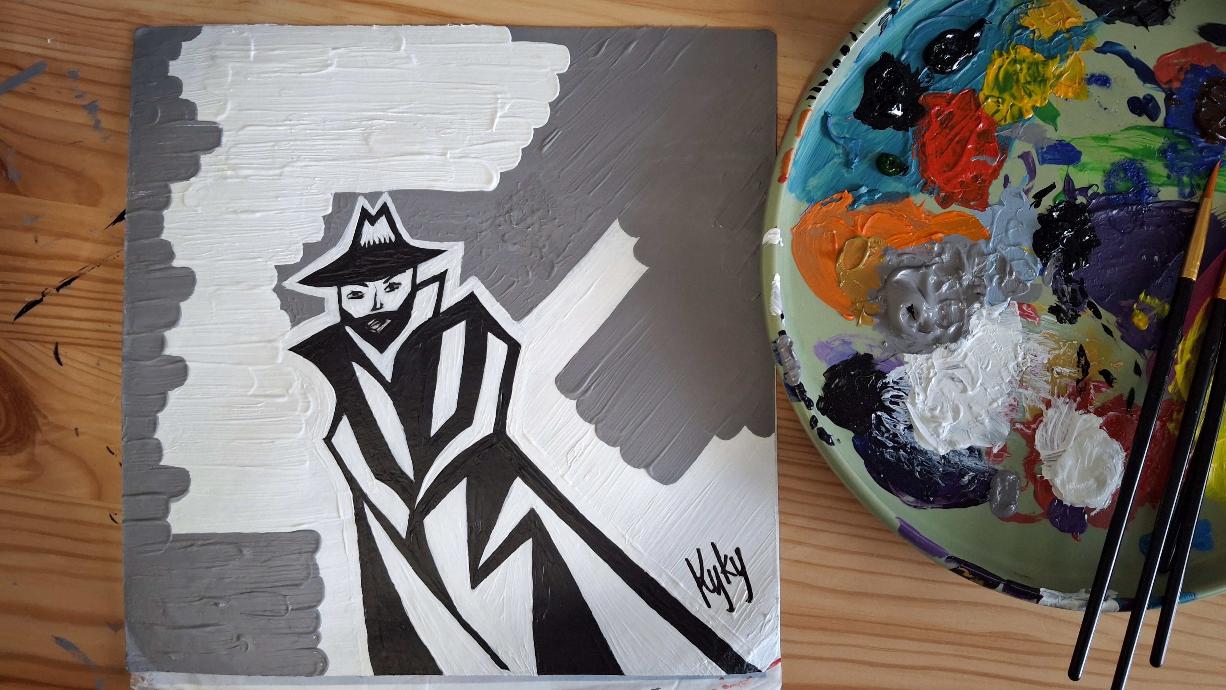 Мой рисунок: мужчина в пальто и шляпе акварелью на бумаге