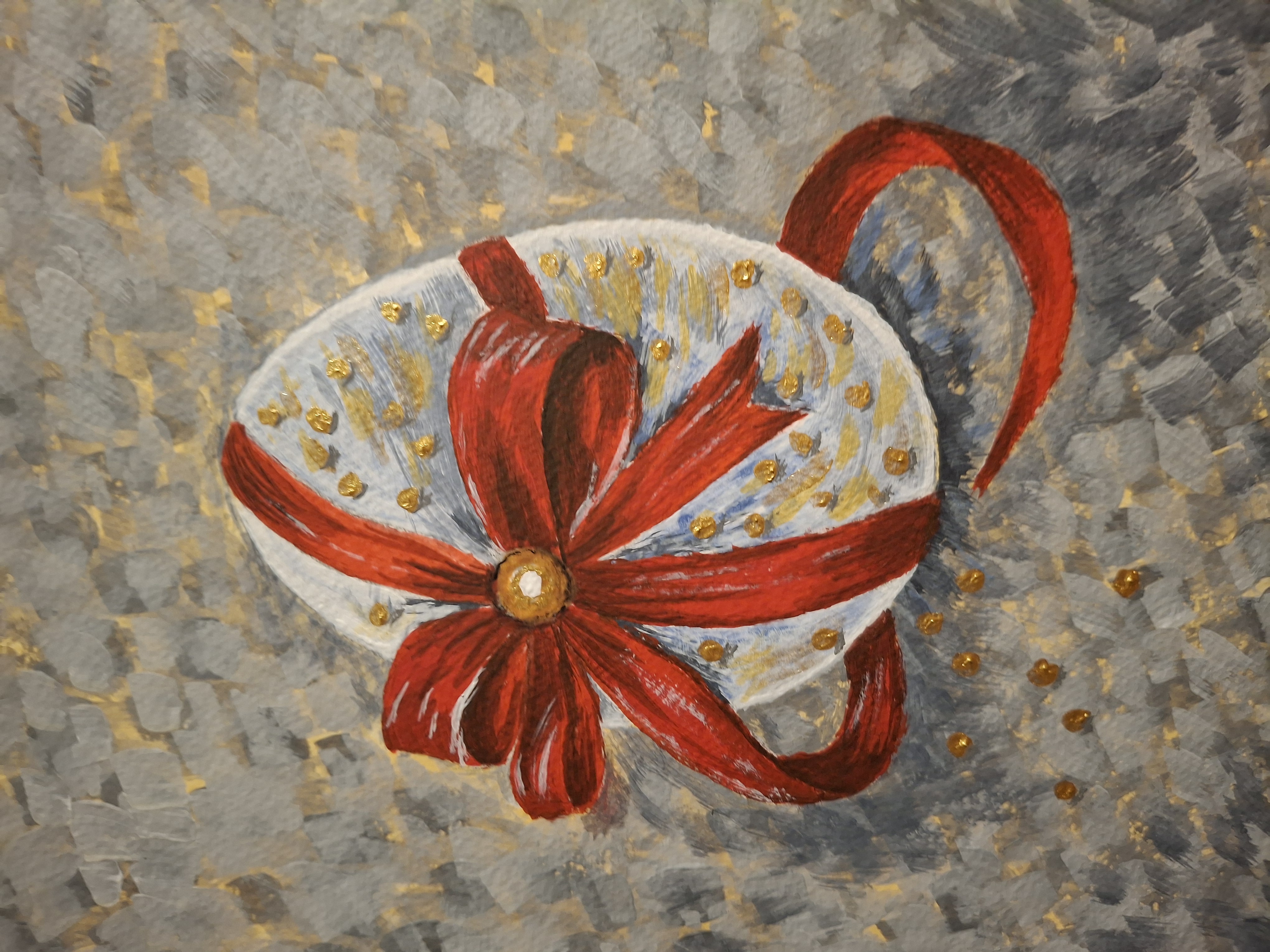 Акрил привлекает меня своей яркостью, простотой в работе. Сначала делаю легкий карандашный рисунок и потом работаю красками. В этой работе краску наносила свободными мазками, что хорошо видно в фоне. Бант рисовала лесировкой…Для украшения есть немного золота…