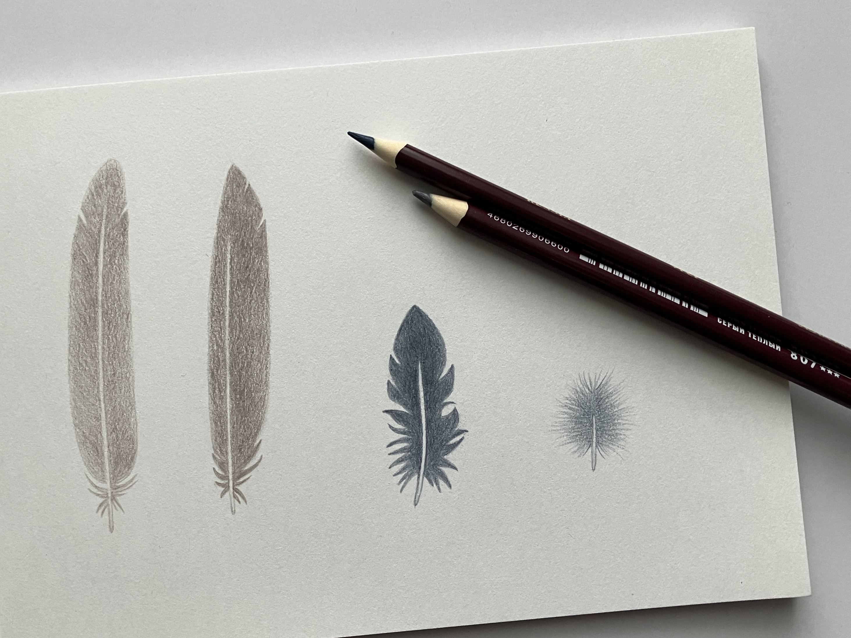 В этот раз я решила перерисовать перья разных типов из книги про птиц двумя оттенками серого: тёплым и холодным.